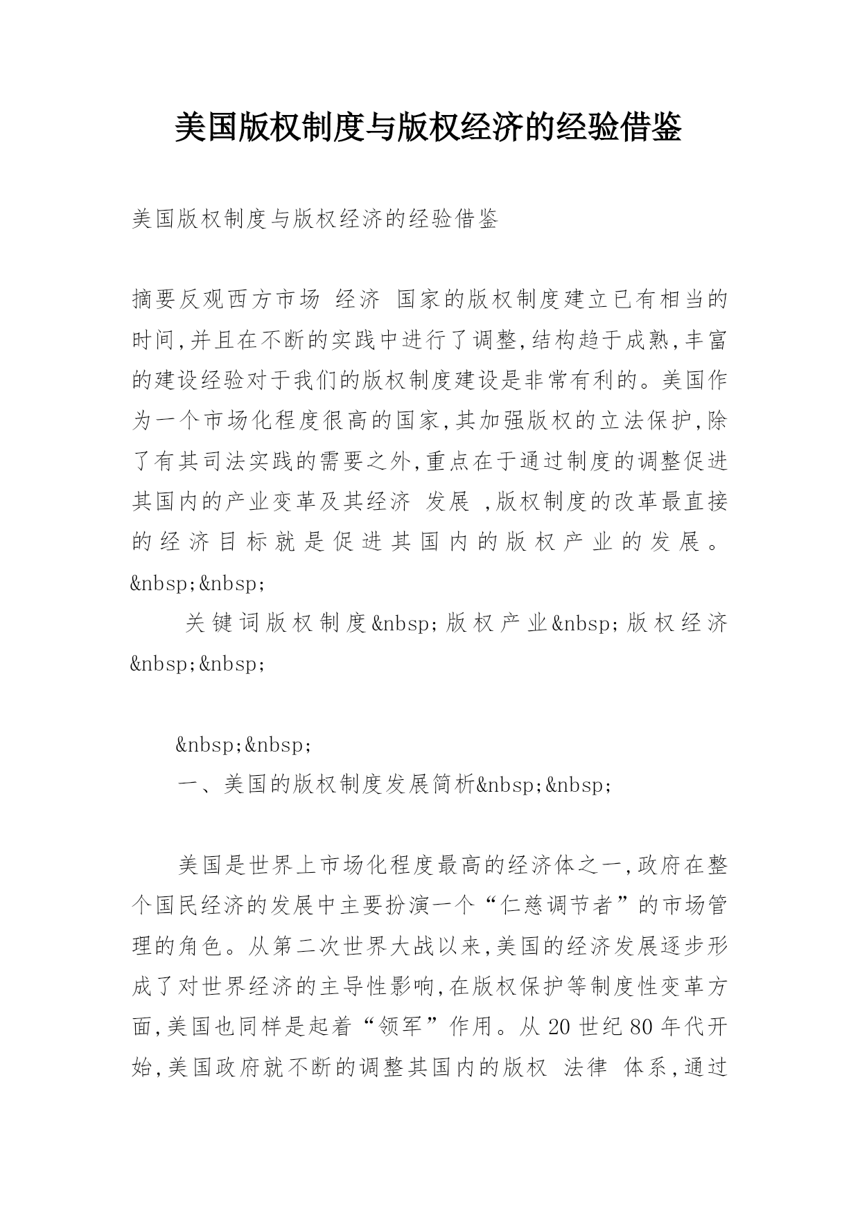 美国版权制度与版权经济的经验借鉴美国版权制度与版权经济的经验借鉴摘要反观西方市场经济国家的版权制度建立已有相当的时间,并且在不断的实践中进行了调整,结构趋于成熟,丰富的建设经验对于我们的版权制度建设是非常有利的。美国作为一个市场化程度很高的国家,其加强版权的立法保护,除了有其司法实践的需要之外,重点在于通过制度的调整促进其国内的产业变革及其经济发展,版权制度的改革最直接的经济目标就是促进其国内的版权产业的发展。 关键词版权制度 版权产业 版权经济 &nb