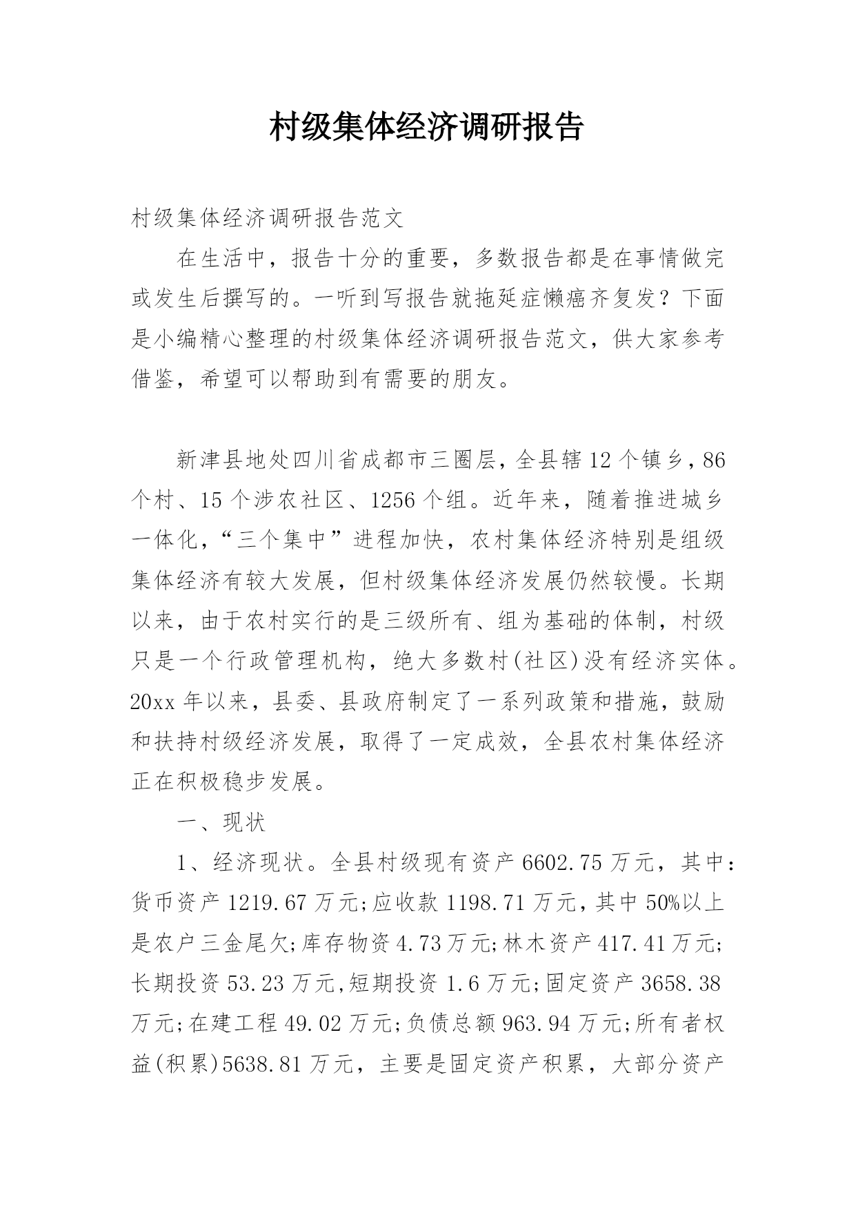 村级集体经济调研报告村级集体经济调研报告范文在生活中,报告十分的重要,多数报告都是在事情做完或发生后撰写的。一听到写报告就拖延症懒癌齐复发?下面是小编精心整理的村级集体经济调研报告范文,供大家参考借鉴,希望可以帮助到有需要的朋友。新津县地处四川省成都市三圈层,全县辖12个镇乡,86个村、15个涉农社区、1256个组。近年来,随着推进城乡一体化,“三个集中”进程加快,农村集体经济特别是组级集体经济有较大发展,但村级集体经济发展仍然较慢。长期以来,由于农村实行的是三级所有、组为基础的体制,村级只是一个行政管理