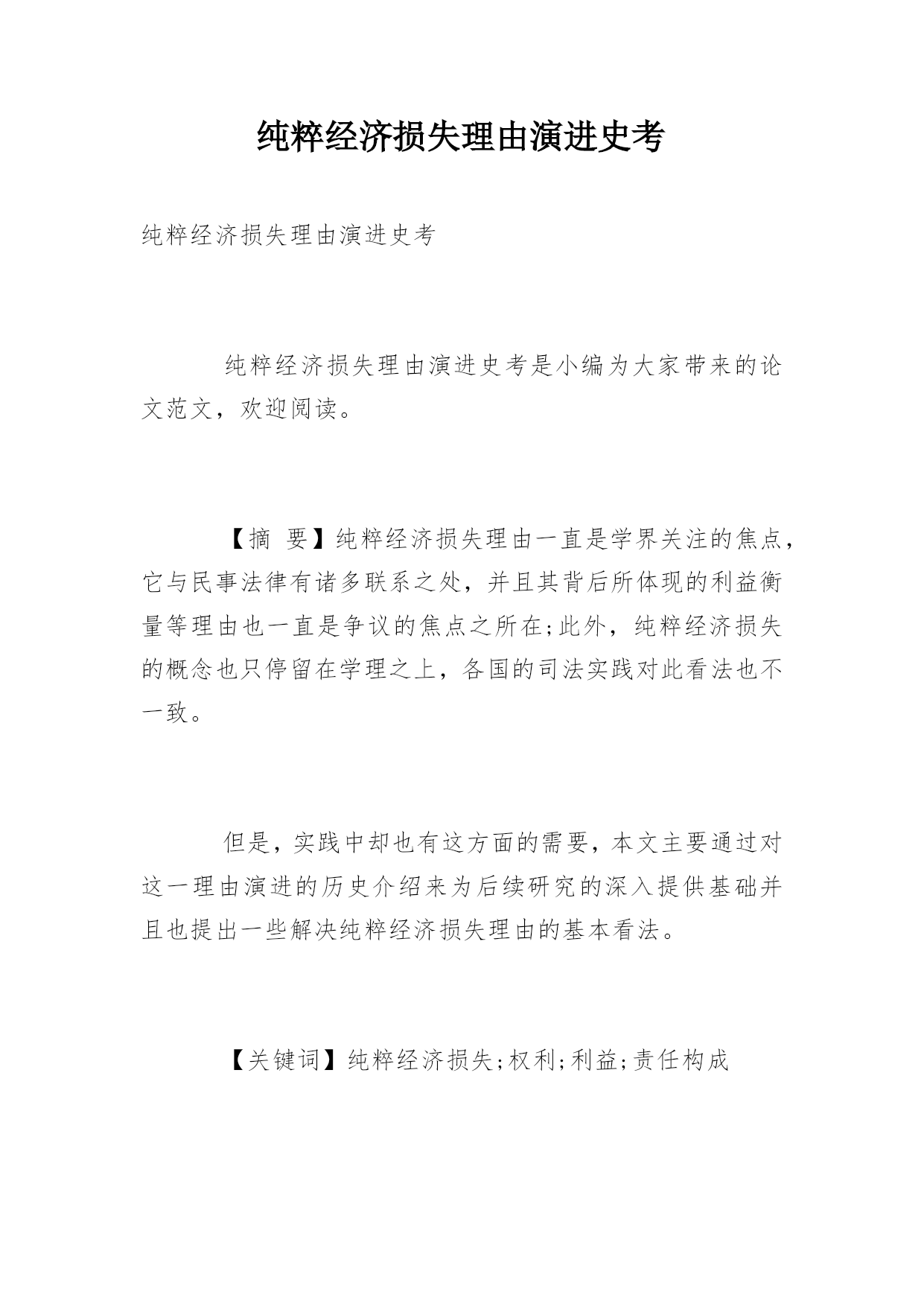 纯粹经济损失理由演进史考纯粹经济损失理由演进史考纯粹经济损失理由演进史考是小编为大家带来的论文范文,欢迎阅读。【摘要】纯粹经济损失理由一直是学界关注的焦点,它与民事法律有诸多联系之处,并且其背后所体现的利益衡量等理由也一直是争议的焦点之所在;此外,纯粹经济损失的概念也只停留在学理之上,各国的司法实践对此看法也不一致。但是,实践中却也有这方面的需要,本文主要通过对这一理由演进的历史介绍来为后续研究的深入提供基础并且也提出一些解决纯粹经济损失理由的基本看法。【关键词】纯粹经济损失;权利;利益;责任构成一、纯粹