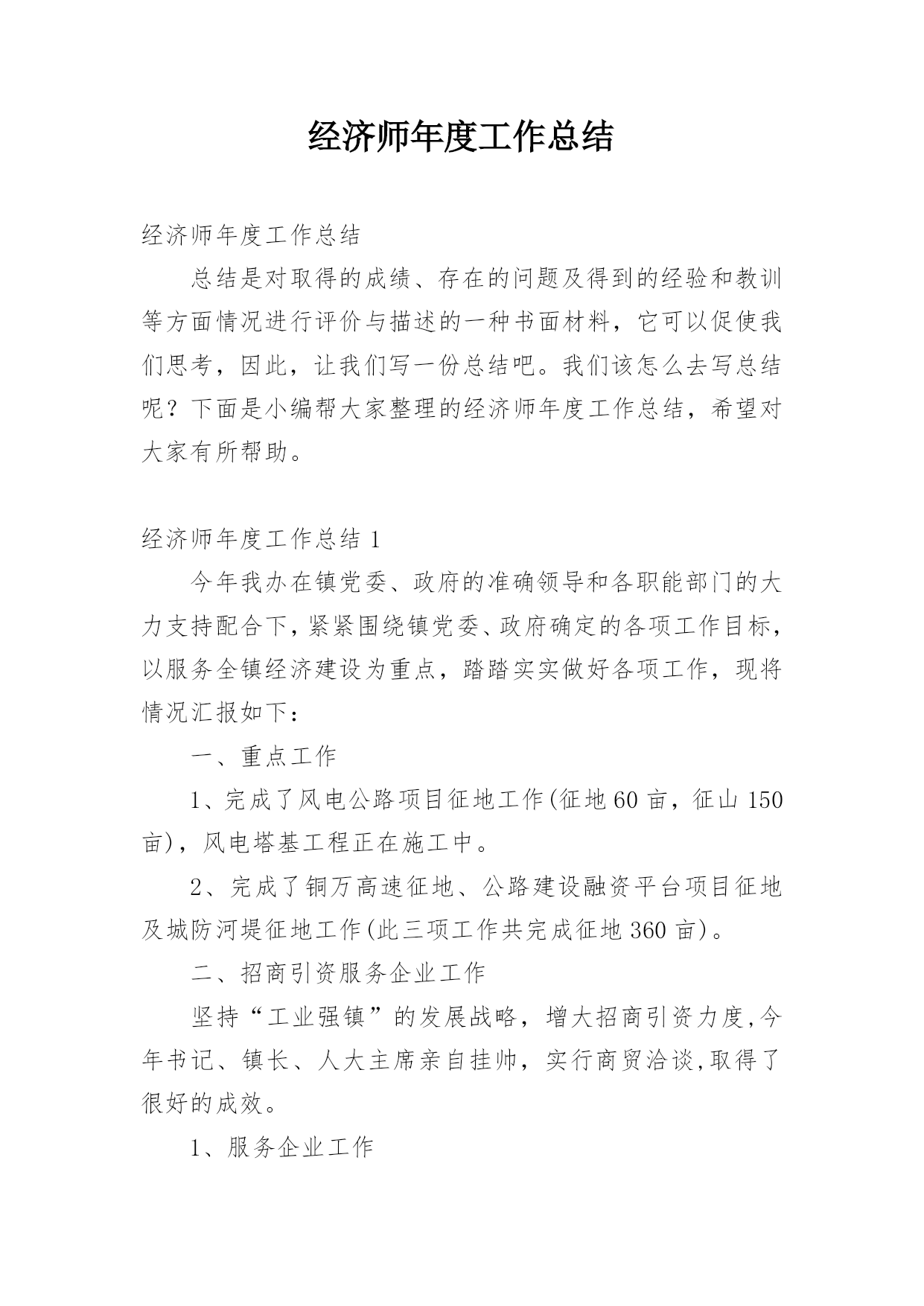 经济师年度工作总结经济师年度工作总结总结是对取得的成绩、存在的问题及得到的经验和教训等方面情况进行评价与描述的一种书面材料,它可以促使我们思考,因此,让我们写一份总结吧。我们该怎么去写总结呢?下面是小编帮大家整理的经济师年度工作总结,希望对大家有所帮助。经济师年度工作总结1今年我办在镇党委、政府的准确领导和各职能部门的大力支持配合下,紧紧围绕镇党委、政府确定的各项工作目标,以服务全镇经济建设为重点,踏踏实实做好各项工作,现将情况汇报如下:一、重点工作1、完成了风电公路项目征地工作(征地60亩,征山150亩
