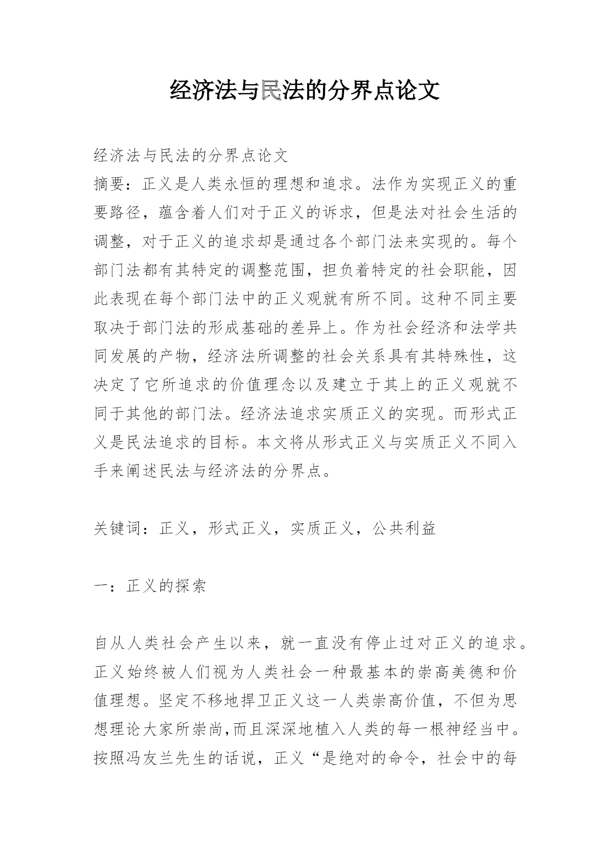 经济法与民法的分界点论文经济法与民法的分界点论文摘要:正义是人类永恒的理想和追求。法作为实现正义的重要路径,蕴含着人们对于正义的诉求,但是法对社会生活的调整,对于正义的追求却是通过各个部门法来实现的。每个部门法都有其特定的调整范围,担负着特定的社会职能,因此表现在每个部门法中的正义观就有所不同。这种不同主要取决于部门法的形成基础的差异上。作为社会经济和法学共同发展的产物,经济法所调整的社会关系具有其特殊性,这决定了它所追求的价值理念以及建立于其上的正义观就不同于其他的部门法。经济法追求实质正义的实现。而形