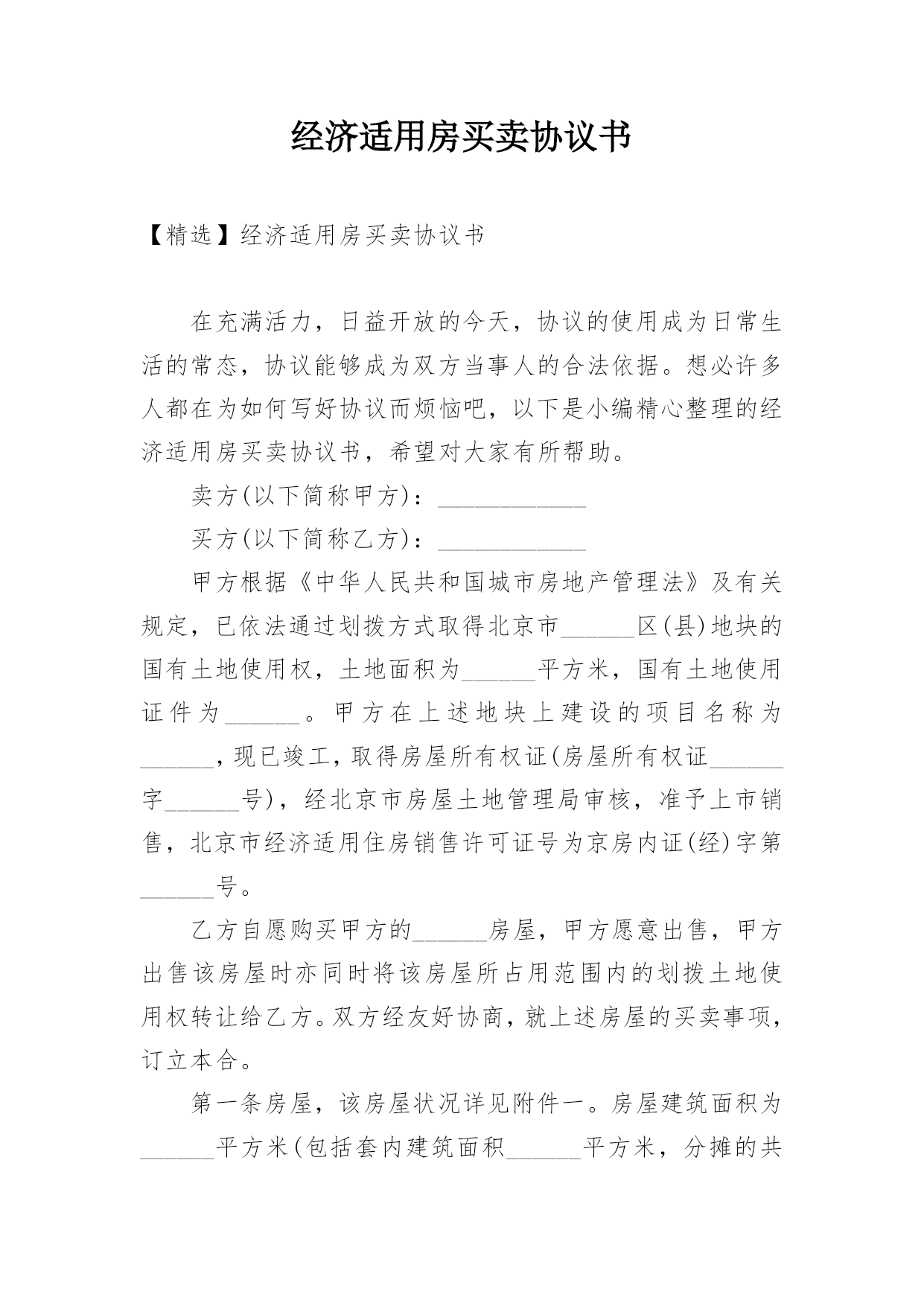 经济适用房买卖协议书【精选】经济适用房买卖协议书在充满活力,日益开放的今天,协议的使用成为日常生活的常态,协议能够成为双方当事人的合法依据。想必许多人都在为如何写好协议而烦恼吧,以下是小编精心整理的经济适用房买卖协议书,希望对大家有所帮助。卖方(以下简称甲方):____________买方(以下简称乙方):____________甲方根据《中华人民共和国城市房地产管理法》及有关规定,已依法通过划拨方式取得北京市______区(县)地块的国有土地使用权,土地面积为______平方米,国有土地使用证件为___