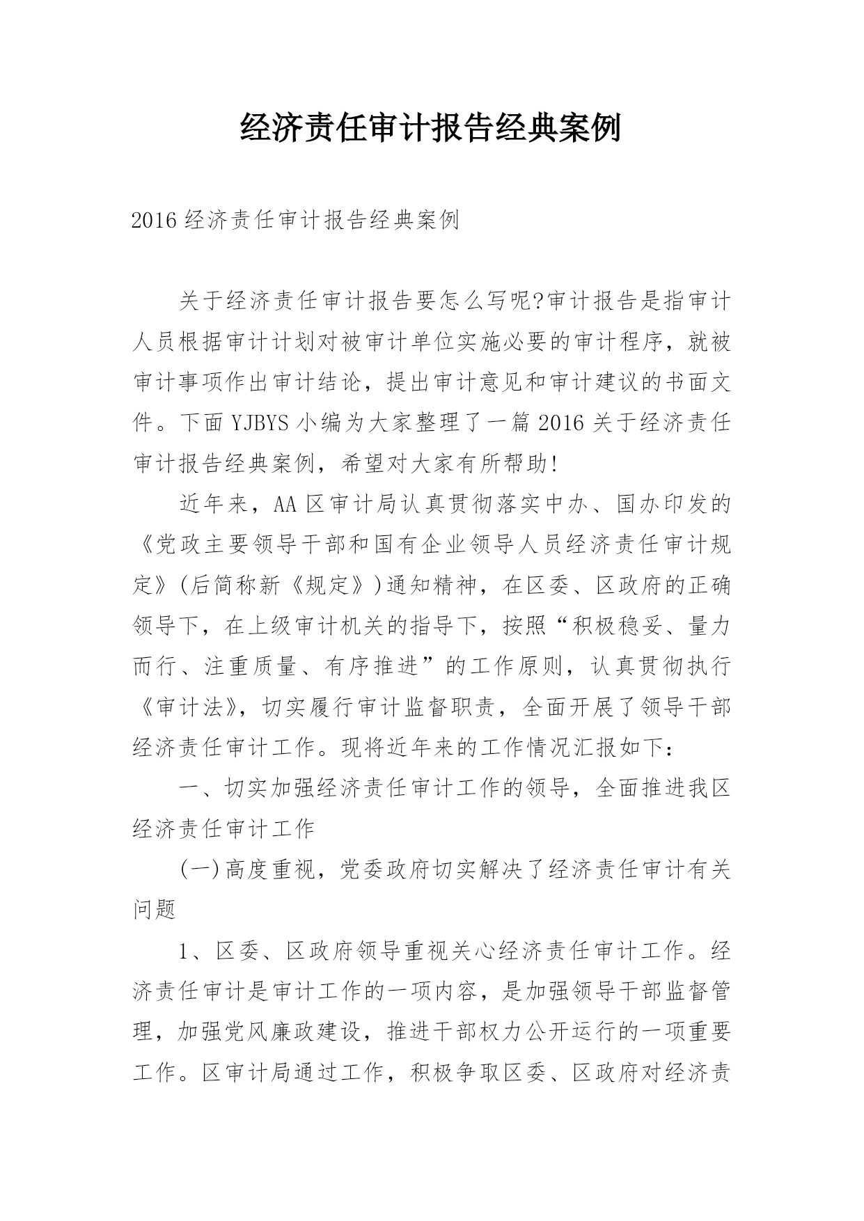 经济责任审计报告经典案例2016经济责任审计报告经典案例关于经济责任审计报告要怎么写呢?审计报告是指审计人员根据审计计划对被审计单位实施必要的审计程序,就被审计事项作出审计结论,提出审计意见和审计建议的书面文件。下面YJBYS小编为大家整理了一篇2016关于经济责任审计报告经典案例,希望对大家有所帮助!近年来,AA区审计局认真贯彻落实中办、国办印发的《党政主要领导干部和国有企业领导人员经济责任审计规定》(后简称新《规定》)通知精神,在区委、区政府的正确领导下,在上级审计机关的指导下,按照“积极稳妥、量力而