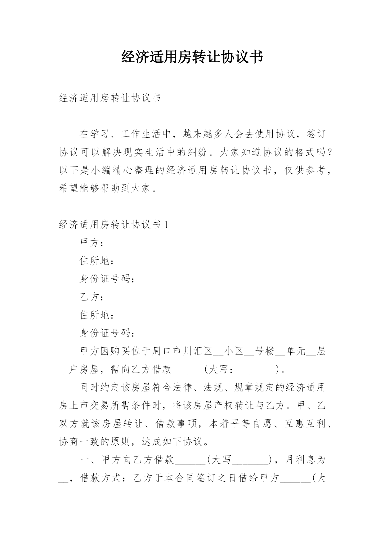 经济适用房转让协议书经济适用房转让协议书在学习、工作生活中,越来越多人会去使用协议,签订协议可以解决现实生活中的纠纷。大家知道协议的格式吗?以下是小编精心整理的经济适用房转让协议书,仅供参考,希望能够帮助到大家。经济适用房转让协议书1甲方:住所地:身份证号码:乙方:住所地:身份证号码:甲方因购买位于周口市川汇区__小区__号楼__单元__层__户房屋,需向乙方借款______(大写:_______)。同时约定该房屋符合法律、法规、规章规定的经济适用房上市交易所需条件时,将该房屋产权转让与乙方。甲、乙双方就