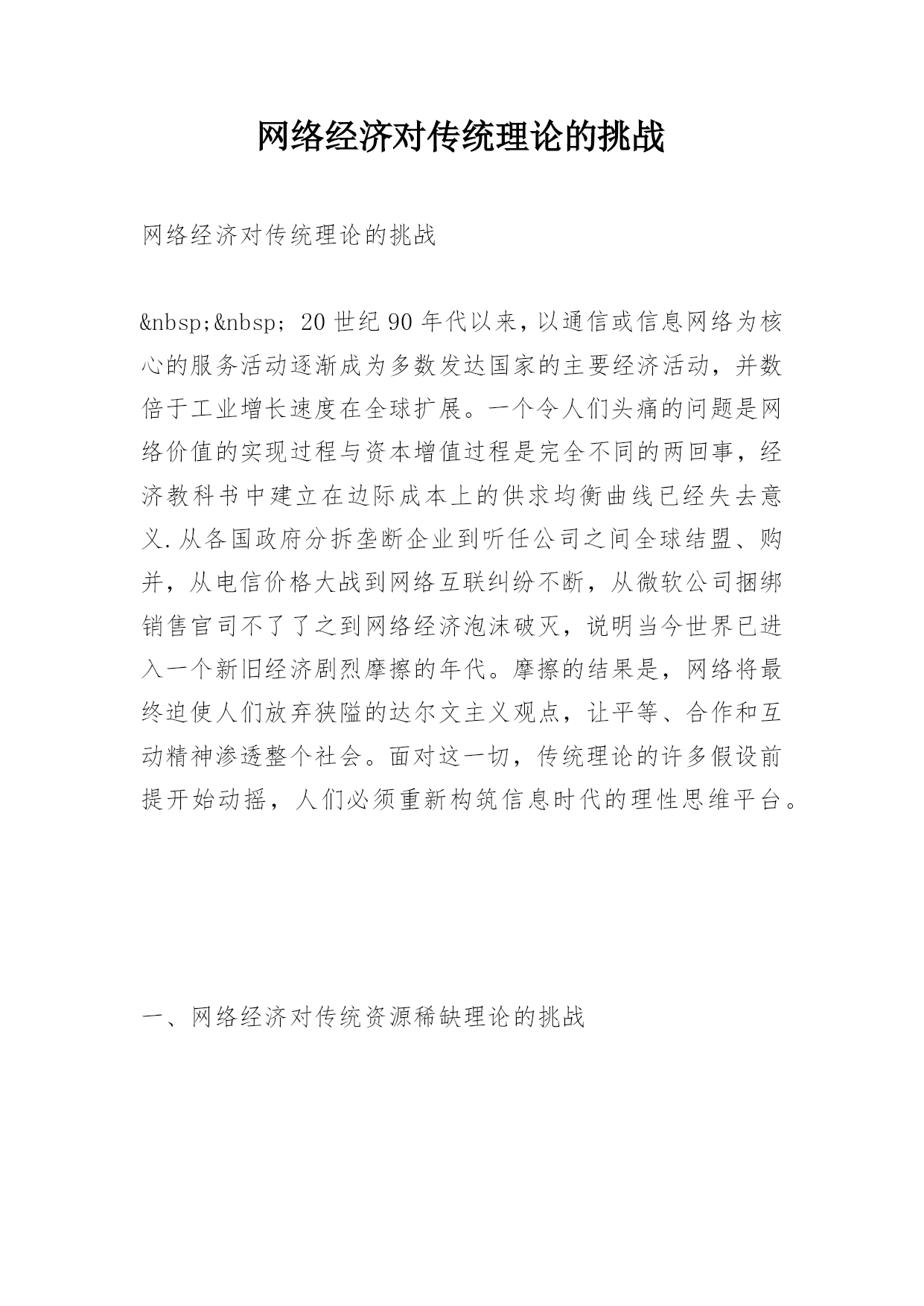 网络经济对传统理论的挑战网络经济对传统理论的挑战 20世纪90年代以来,以通信或信息网络为核心的服务活动逐渐成为多数发达国家的主要经济活动,并数倍于工业增长速度在全球扩展。一个令人们头痛的问题是网络价值的实现过程与资本增值过程是完全不同的两回事,经济教科书中建立在边际成本上的供求均衡曲线已经失去意义.从各国政府分拆垄断企业到听任公司之间全球结盟、购并,从电信价格大战到网络互联纠纷不断,从微软公司捆绑销售官司不了了之到网络经济泡沫破灭,说明当今世界已进入一个新旧经济剧烈摩擦的年代。摩擦