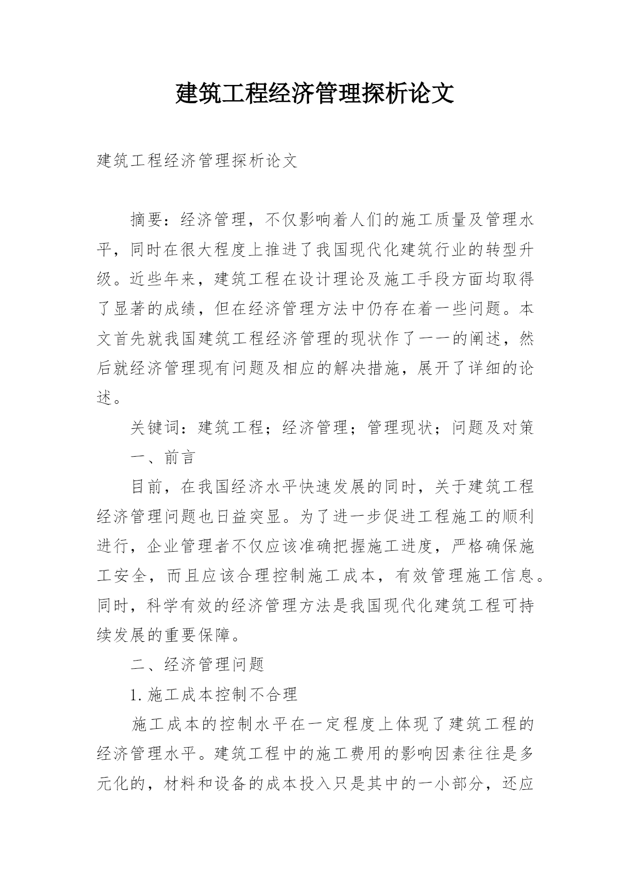 建筑工程经济管理探析论文建筑工程经济管理探析论文摘要:经济管理,不仅影响着人们的施工质量及管理水平,同时在很大程度上推进了我国现代化建筑行业的转型升级。近些年来,建筑工程在设计理论及施工手段方面均取得了显著的成绩,但在经济管理方法中仍存在着一些问题。本文首先就我国建筑工程经济管理的现状作了一一的阐述,然后就经济管理现有问题及相应的解决措施,展开了详细的论述。关键词:建筑工程;经济管理;管理现状;问题及对策一、前言目前,在我国经济水平快速发展的同时,关于建筑工程经济管理问题也日益突显。为了进一步促进工程施工