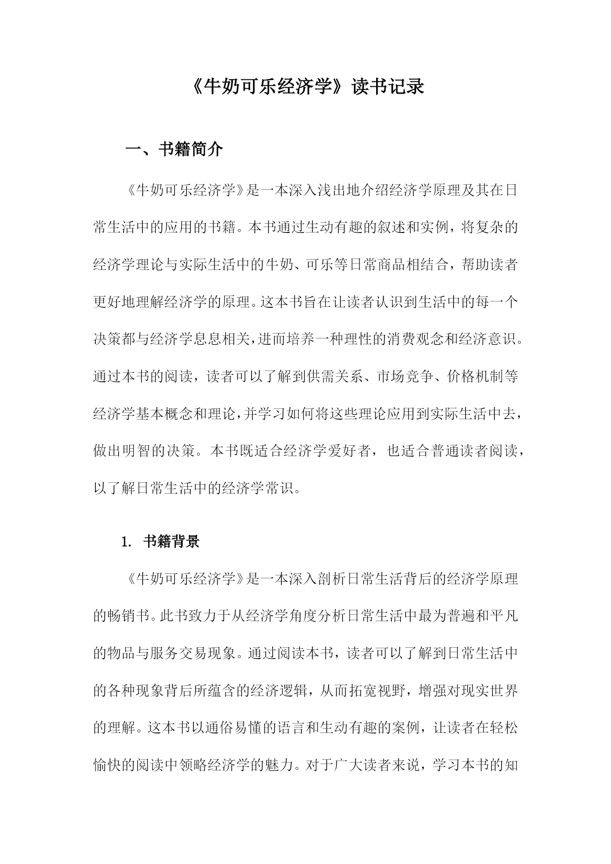 《牛奶可乐经济学》读书记录一、书籍简介《牛奶可乐经济学》是一本深入浅出地介绍经济学原理及其在日常生活中的应用的书籍。本书通过生动有趣的叙述和实例,将复杂的经济学理论与实际生活中的牛奶、可乐等日常商品相结合,帮助读者更好地理解经济学的原理。这本书旨在让读者认识到生活中的每一个决策都与经济学息息相关,进而培养一种理性的消费观念和经济意识。通过本书的阅读,读者可以了解到供需关系、市场竞争、价格机制等经济学基本概念和理论,并学习如何将这些理论应用到实际生活中去,做出明智的决策。本书既适合经济学爱好者,也适合普通读