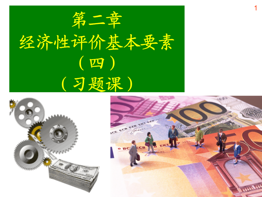 第二章经济性评价基本要素(四)(习题课)例题套已知F求P公式:套已知F求P公式:典型习题:下图中,考虑资金的时间价值后,总现金流出等于总现金流入。试利用各种资金等值计算系数,用已知项表示未知项。(1)已知A1,A2,P1,i,求P2;(2)已知P1,P2,A1,i,求A2;(3)已知P1,P2,A2,i,求A1。(2)解:由题意,在第五年末,有P1(F/P,i,5)+P2=A1(F/A,i,4)(F/P,i,1)+A2(P/A,i,5)故有:A2=[P1(F/P,i,5)+P2-A1(F/A,i,4)(F