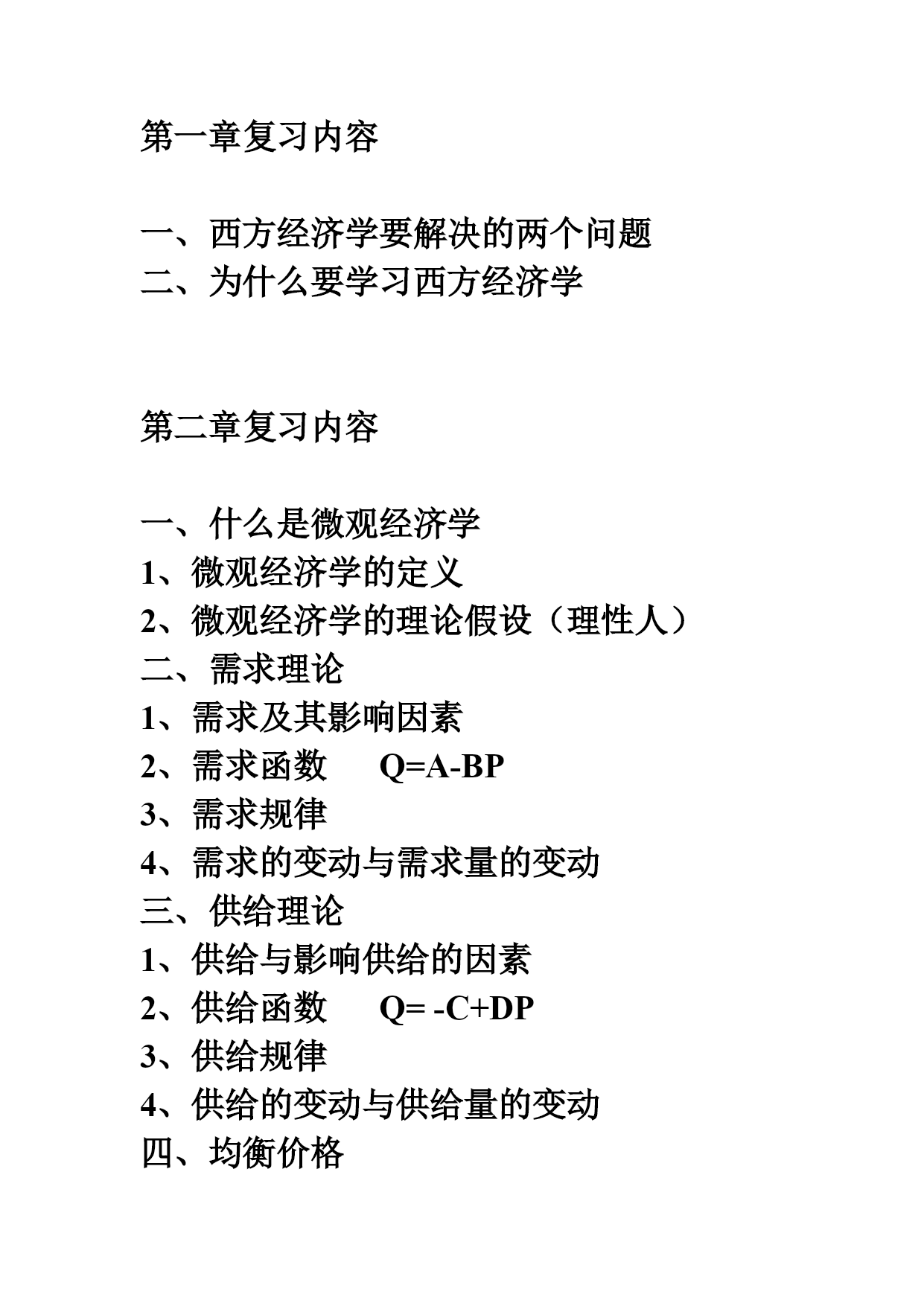 复习内容西方经济学要解决的两个问题为什么要学习西方经济学复习内容什么是微观经济学微观经济学的定义微观经济学的理论假设(理性人)需求理论需求及其影响因素需求函数Q=A-BP需求规律需求的变动与需求量的变动供给理论供给与影响供给的因素供给函数Q=-C+DP供给规律供给的变动与供给量的变动均衡价格均衡价格的概念均衡价格的决定供求定理:其他条件不变的情况下,需求变动引起均衡价格同方向变动,引起均衡数量同方向变动;供给变动引起均衡价格反方向变动,引起均衡数量同方向变动。计算题举例:P67(1、3)需求弹性理论需求价