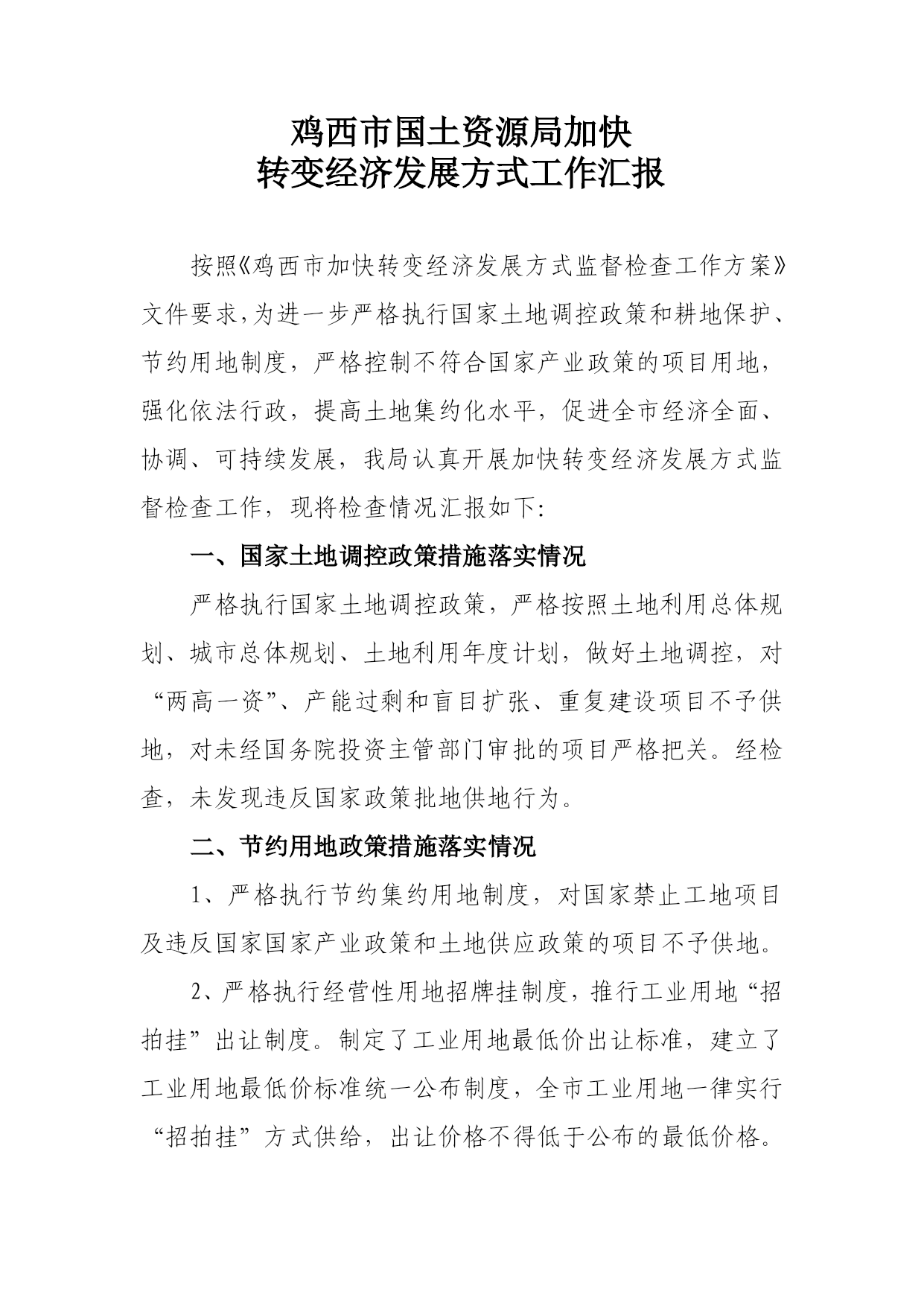 鸡西市国土资源局加快转变经济发展方式工作汇报按照《鸡西市加快转变经济发展方式监督检查工作方案》文件要求,为进一步严格执行国家土地调控政策和耕地保护、节约用地制度,严格控制不符合国家产业政策的项目用地,强化依法行政,提高土地集约化水平,促进全市经济全面、协调、可持续发展,我局认真开展加快转变经济发展方式监督检查工作,现将检查情况汇报如下:一、国家土地调控政策措施落实情况严格执行国家土地调控政策,严格按照土地利用总体规划、城市总体规划、土地利用年度计划,做好土地调控,对“两高一资”、产能过剩和盲目扩张、重复建