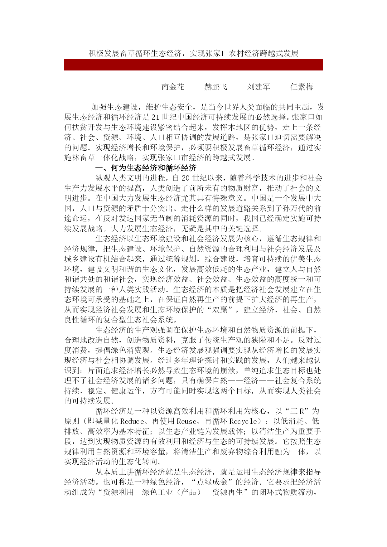 积极发展畜草循环生态经济,实现张家口农村经济跨越式发展南金花赫鹏飞刘建军任素梅加强生态建设,维护生态安全,是当今世界人类面临的共同主题,发展生态经济和循环经济是21世纪中国经济可持续发展的必然选择。张家口如何扶贫开发与生态环境建设紧密结合起来,发挥本地区的优势,走上一条经济、社会、资源、环境、人口相互协调的发展道路,是张家口迫切需要解决的问题。实现经济增长和环境保护,必须要积极发展畜草循环经济,通过实施林畜草一体化战略,实现张家口市经济的跨越式发展。一、何为生态经济和循环经济纵观人类文明的进程,自20世纪