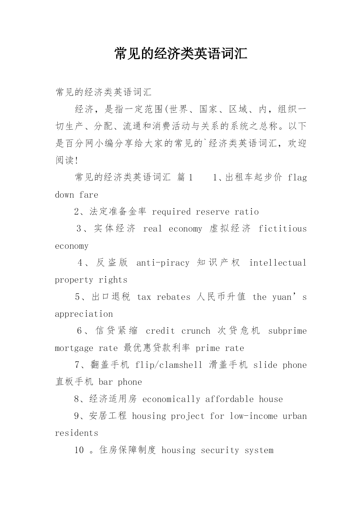常见的经济类英语词汇常见的经济类英语词汇经济,是指一定范围(世界、国家、区域、内,组织一切生产、分配、流通和消费活动与关系的系统之总称。以下是百分网小编分享给大家的常见的`经济类英语词汇,欢迎阅读!常见的经济类英语词汇篇11、出租车起步价flagdownfare2、法定准备金率requiredreserveratio3、实体经济realeconomy虚拟经济fictitiouseconomy4、反盗版anti-piracy知识产权intellectualpropertyrights5、出口退税taxreb