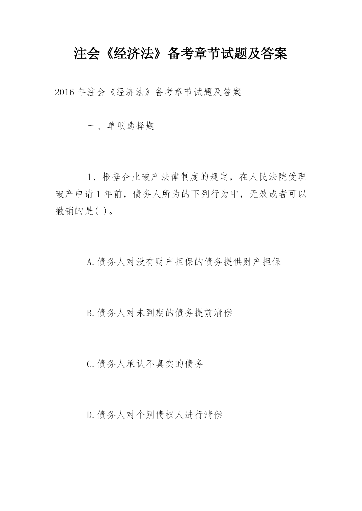 注会《经济法》备考章节试题及答案2016年注会《经济法》备考章节试题及答案一、单项选择题1、根据企业破产法律制度的规定,在人民法院受理破产申请1年前,债务人所为的下列行为中,无效或者可以撤销的是()。A.债务人对没有财产担保的债务提供财产担保B.债务人对未到期的债务提前清偿C.债务人承认不真实的债务D.债务人对个别债权人进行清偿2、根据企业破产法律制度的规定,下列各项中,属于债权人会议职权的是()。A.调查债务人的财产状况,制作财产状况报告B.决定债务人的日常开支C.决定债务人的内部管理事务D.通过债务人
