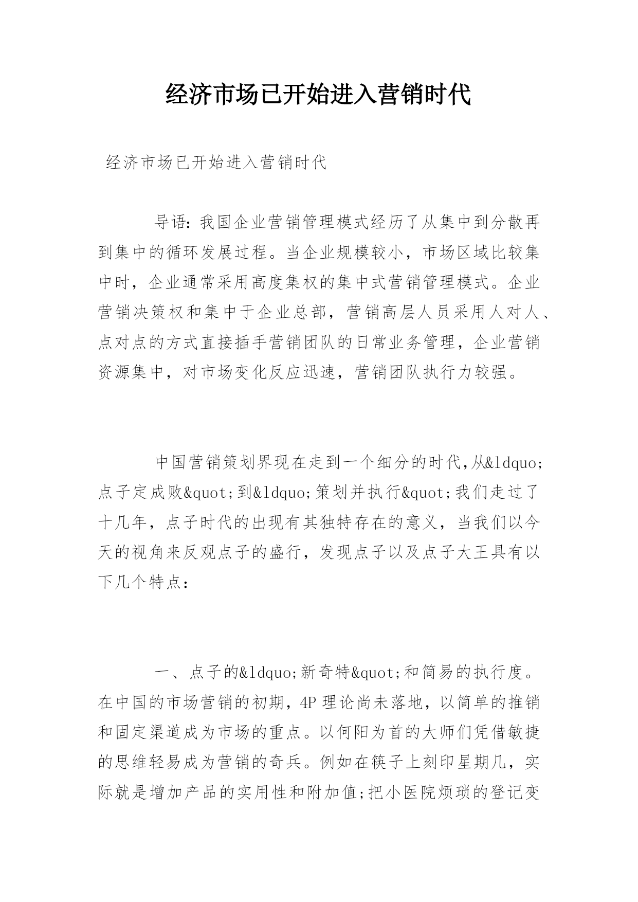 经济市场已开始进入营销时代经济市场已开始进入营销时代导语:我国企业营销管理模式经历了从集中到分散再到集中的循环发展过程。当企业规模较小,市场区域比较集中时,企业通常采用高度集权的集中式营销管理模式。企业营销决策权和集中于企业总部,营销高层人员采用人对人、点对点的方式直接插手营销团队的日常业务管理,企业营销资源集中,对市场变化反应迅速,营销团队执行力较强。中国营销策划界现在走到一个细分的时代,从“点子定成败"到“策划并执行"我们走过了十几年,点子时代的出现有其独特