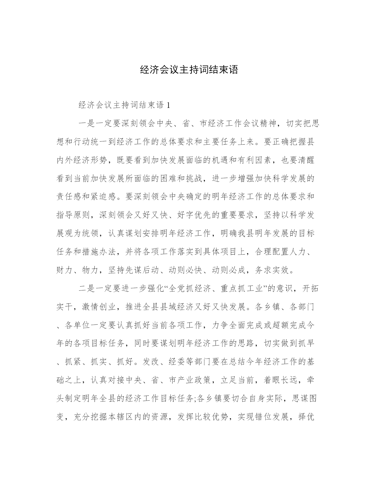 经济会议主持词结束语经济会议主持词结束语1一是一定要深刻领会中央、省、市经济工作会议精神,切实把思想和行动统一到经济工作的总体要求和主要任务上来。要正确把握县内外经济形势,既要看到加快发展面临的机遇和有利因素,也要清醒看到当前加快发展所面临的困难和挑战,进一步增强加快科学发展的责任感和紧迫感。要深刻领会中央确定的明年经济工作的总体要求和指导原则,深刻领会又好又快、好字优先的重要要求,坚持以科学发展观为统领,认真谋划安排明年经济工作,明确我县明年发展的目标任务和措施办法,并将各项工作落实到具体项目上,合理配