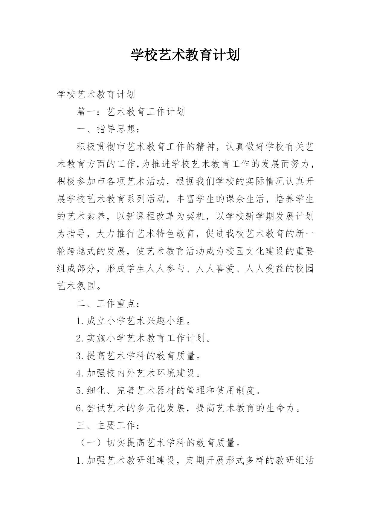学校艺术教育计划学校艺术教育计划篇一:艺术教育工作计划一、指导思想:积极贯彻市艺术教育工作的精神,认真做好学校有关艺术教育方面的工作,为推进学校艺术教育工作的发展而努力,积极参加市各项艺术活动,根据我们学校的实际情况认真开展学校艺术教育系列活动,丰富学生的课余生活,培养学生的艺术素养,以新课程改革为契机,以学校新学期发展计划为指导,大力推行艺术特色教育,促进我校艺术教育的新一轮跨越式的发展,使艺术教育活动成为校园文化建设的重要组成部分,形成学生人人参与、人人喜爱、人人受益的校园艺术氛围。二、工作重点:1.