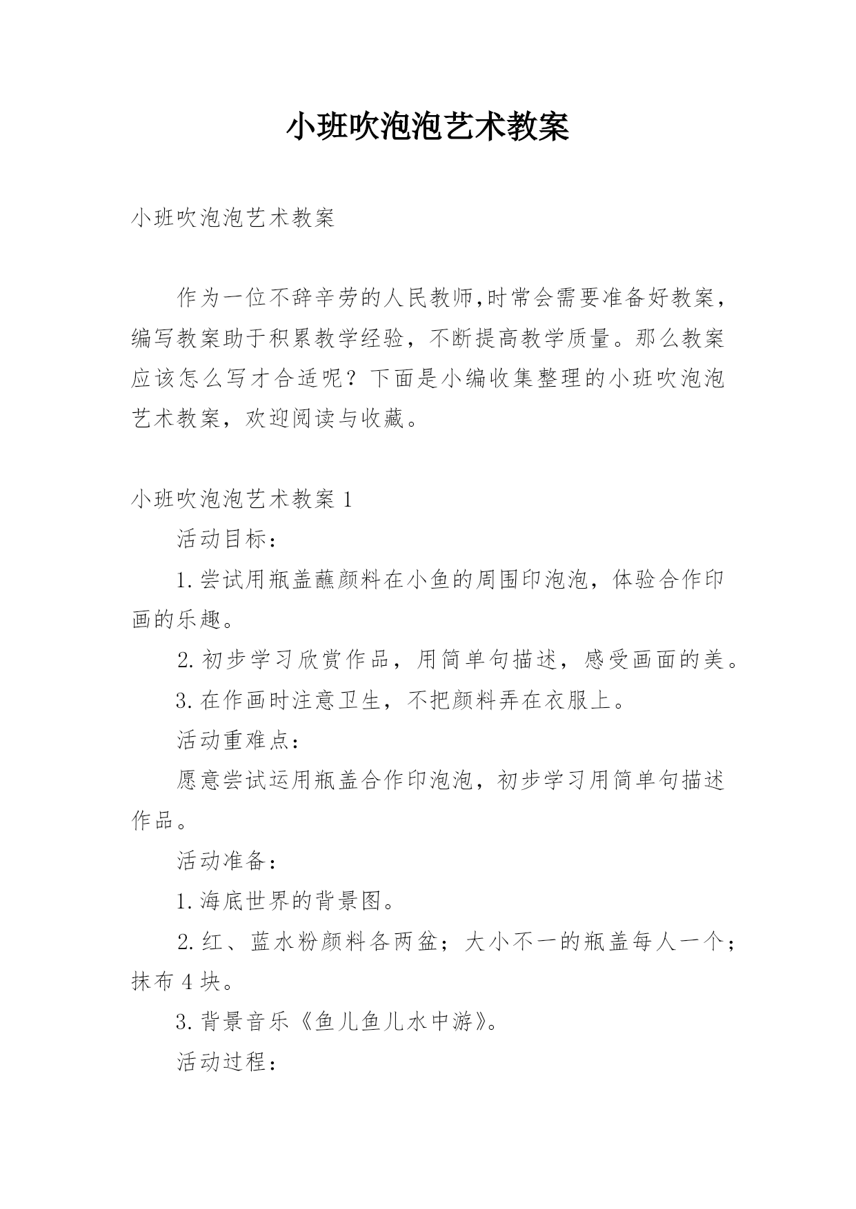 小班吹泡泡艺术教案小班吹泡泡艺术教案作为一位不辞辛劳的人民教师,时常会需要准备好教案,编写教案助于积累教学经验,不断提高教学质量。那么教案应该怎么写才合适呢?下面是小编收集整理的小班吹泡泡艺术教案,欢迎阅读与收藏。小班吹泡泡艺术教案1活动目标:1.尝试用瓶盖蘸颜料在小鱼的周围印泡泡,体验合作印画的乐趣。2.初步学习欣赏作品,用简单句描述,感受画面的美。3.在作画时注意卫生,不把颜料弄在衣服上。活动重难点:愿意尝试运用瓶盖合作印泡泡,初步学习用简单句描述作品。活动准备:1.海底世界的背景图。2.红、蓝水粉颜