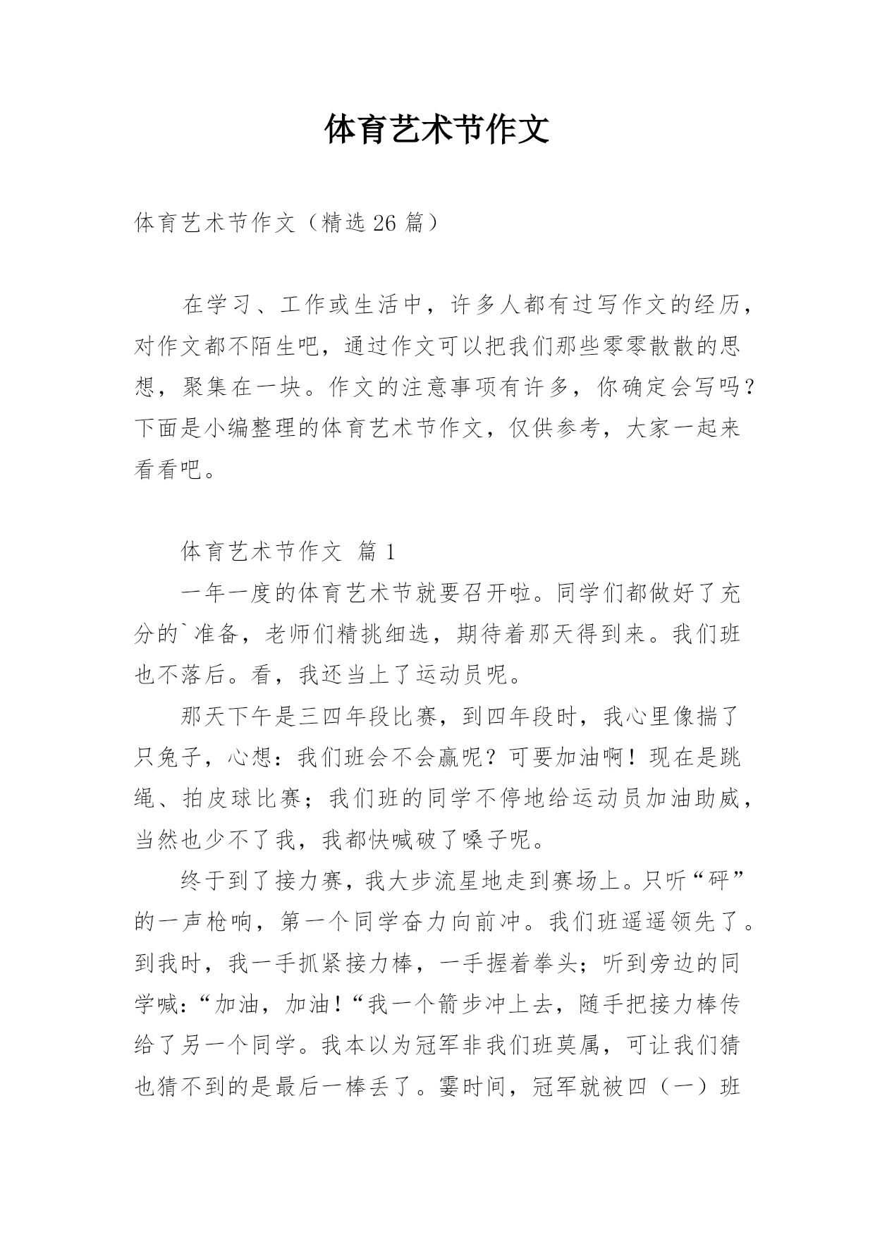 体育艺术节作文体育艺术节作文(精选26篇)在学习、工作或生活中,许多人都有过写作文的经历,对作文都不陌生吧,通过作文可以把我们那些零零散散的思想,聚集在一块。作文的注意事项有许多,你确定会写吗?下面是小编整理的体育艺术节作文,仅供参考,大家一起来看看吧。体育艺术节作文篇1一年一度的体育艺术节就要召开啦。同学们都做好了充分的`准备,老师们精挑细选,期待着那天得到来。我们班也不落后。看,我还当上了运动员呢。那天下午是三四年段比赛,到四年段时,我心里像揣了只兔子,心想:我们班会不会赢呢?可要加油啊!现在是跳绳、