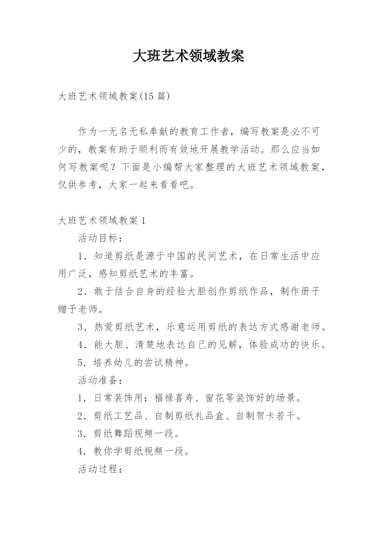 大班艺术领域教案大班艺术领域教案(15篇)作为一无名无私奉献的教育工作者,编写教案是必不可少的,教案有助于顺利而有效地开展教学活动。那么应当如何写教案呢?下面是小编帮大家整理的大班艺术领域教案,仅供参考,大家一起来看看吧。大班艺术领域教案1活动目标:1.知道剪纸是源于中国的民间艺术,在日常生活中应用广泛,感知剪纸艺术的丰富。2.敢于结合自身的经验大胆创作剪纸作品,制作册子赠予老师。3.热爱剪纸艺术,乐意运用剪纸的表达方式感谢老师。4.能大胆、清楚地表达自己的见解,体验成功的快乐。5.培养幼儿的尝试精神。活
