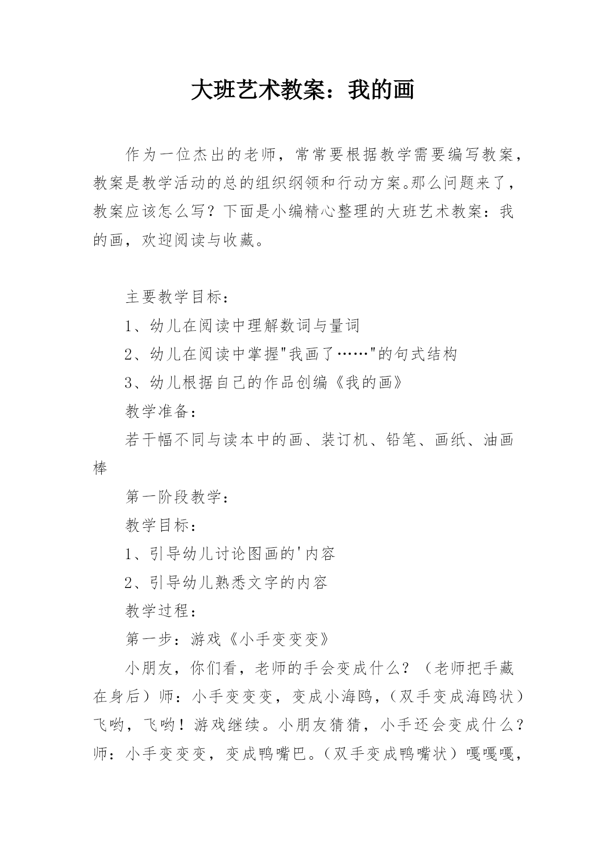 大班艺术教案:我的画作为一位杰出的老师,常常要根据教学需要编写教案,教案是教学活动的总的组织纲领和行动方案。那么问题来了,教案应该怎么写?下面是小编精心整理的大班艺术教案:我的画,欢迎阅读与收藏。主要教学目标:1、幼儿在阅读中理解数词与量词2、幼儿在阅读中掌握"我画了……"的句式结构3、幼儿根据自己的作品创编《我的画》教学准备:若干幅不同与读本中的画、装订机、铅笔、画纸、油画棒第一阶段教学:教学目标:1、引导幼儿讨论图画的'内容2、引导幼儿熟悉文字的内容教学过程:第一步:游戏《小手变变变》小朋友,你们看,