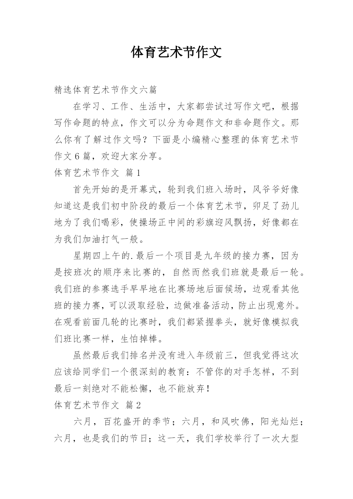 体育艺术节作文精选体育艺术节作文六篇在学习、工作、生活中,大家都尝试过写作文吧,根据写作命题的特点,作文可以分为命题作文和非命题作文。那么你有了解过作文吗?下面是小编精心整理的体育艺术节作文6篇,欢迎大家分享。体育艺术节作文篇1首先开始的是开幕式,轮到我们班入场时,风爷爷好像知道这是我们初中阶段的最后一个体育艺术节,卯足了劲儿地为了我们喝彩,使操场正中间的彩旗迎风飘扬,好像都在为我们加油打气一般。星期四上午的.最后一个项目是九年级的接力赛,因为是按班次的顺序来比赛的,自然而然我们班就是最后一轮。我们班的参