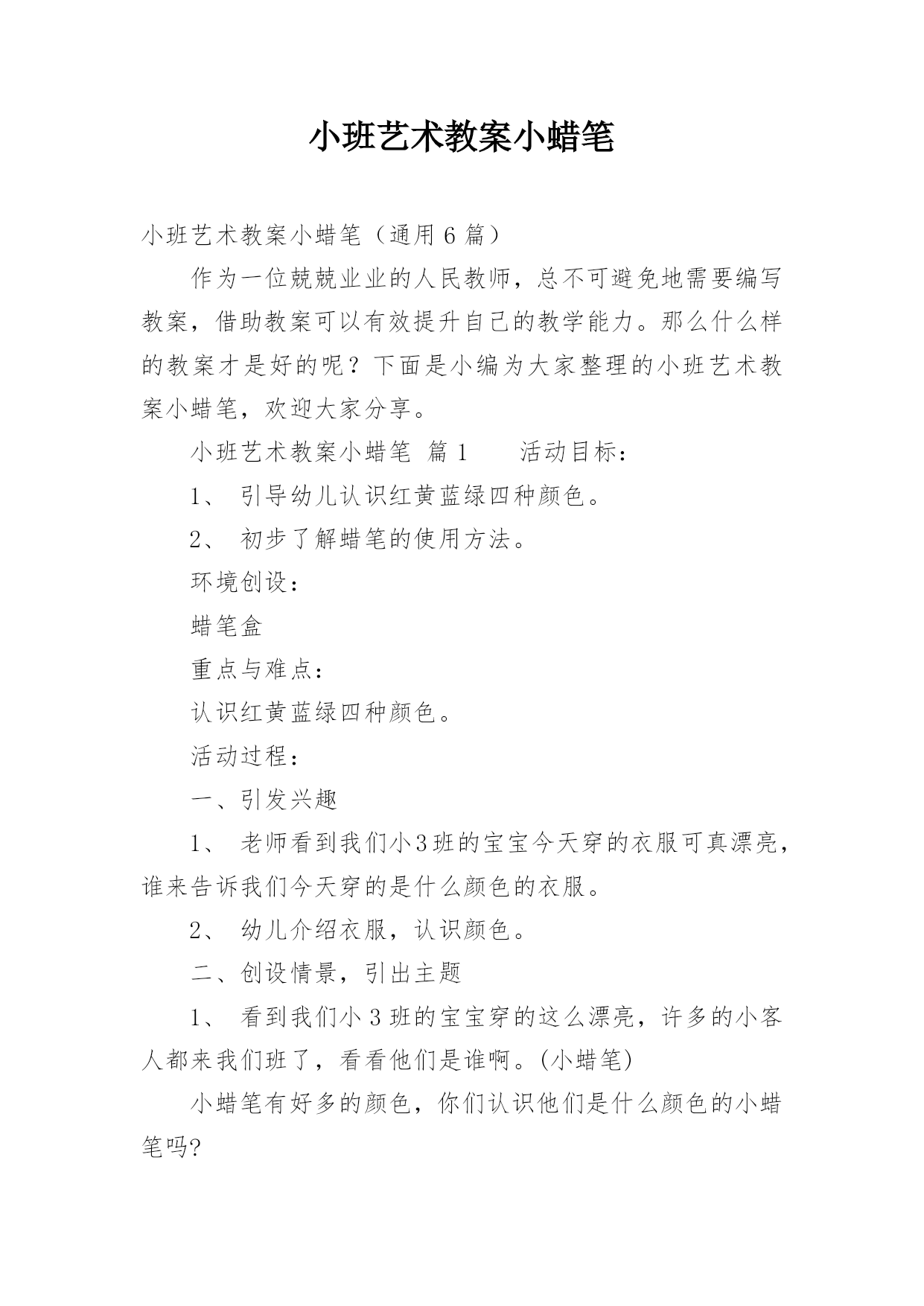 小班艺术教案小蜡笔小班艺术教案小蜡笔(通用6篇)作为一位兢兢业业的人民教师,总不可避免地需要编写教案,借助教案可以有效提升自己的教学能力。那么什么样的教案才是好的呢?下面是小编为大家整理的小班艺术教案小蜡笔,欢迎大家分享。小班艺术教案小蜡笔篇1活动目标:1、引导幼儿认识红黄蓝绿四种颜色。2、初步了解蜡笔的使用方法。环境创设:蜡笔盒重点与难点:认识红黄蓝绿四种颜色。活动过程:一、引发兴趣1、老师看到我们小3班的宝宝今天穿的衣服可真漂亮,谁来告诉我们今天穿的是什么颜色的衣服。2、幼儿介绍衣服,认识颜色。二、创