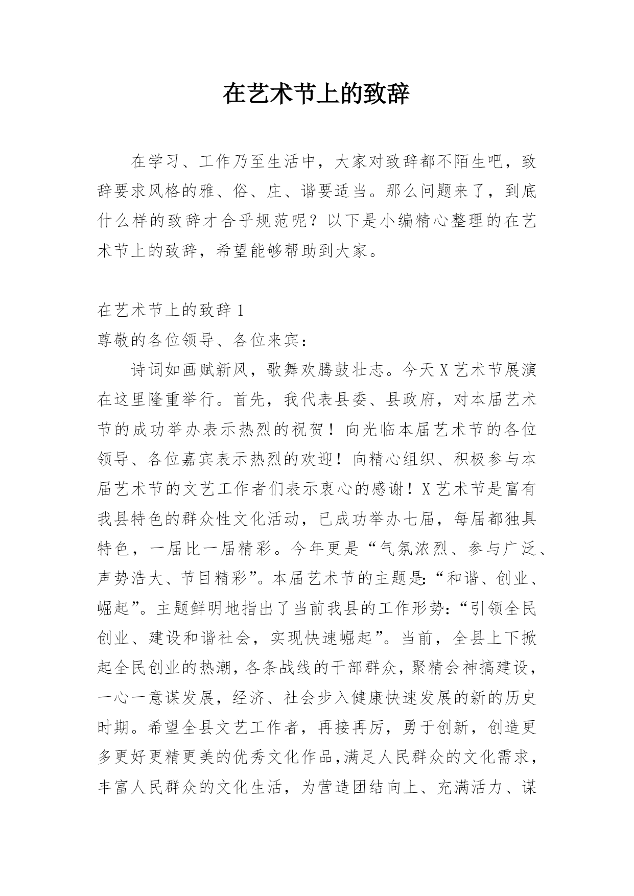 在艺术节上的致辞在学习、工作乃至生活中,大家对致辞都不陌生吧,致辞要求风格的雅、俗、庄、谐要适当。那么问题来了,到底什么样的致辞才合乎规范呢?以下是小编精心整理的在艺术节上的致辞,希望能够帮助到大家。在艺术节上的致辞1尊敬的各位领导、各位来宾:诗词如画赋新风,歌舞欢腾鼓壮志。今天X艺术节展演在这里隆重举行。首先,我代表县委、县政府,对本届艺术节的成功举办表示热烈的祝贺!向光临本届艺术节的各位领导、各位嘉宾表示热烈的欢迎!向精心组织、积极参与本届艺术节的文艺工作者们表示衷心的感谢!X艺术节是富有我县特色的群