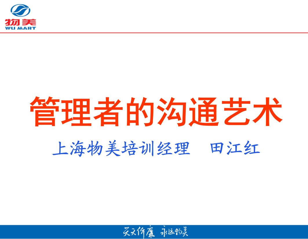 管理者的沟通艺术上海物美培训经理田江红讲师介绍田江红八年军旅生涯香港维多利亚工商管理学院MBA国际职业培训师协会培训师美国ICQAC培训机构授权讲师历任中德合资金德管业集团培训中心校长现任上海物美培训经理训勉:士不可不弘毅,任重而道远。二十一世纪是一个充满激烈竞争的时代,作为一名成功的职业经理人,不仅要有应对问题和挫折的能力,还要与客户、同事、合作伙伴和供应商建立良好的人际关系。因此,提升沟通艺术,并对人际关系进行良好的运作,就成为事业成功的重要保证。沟通不是一种本能,而是一种能力。沟通的四个目的1、控制