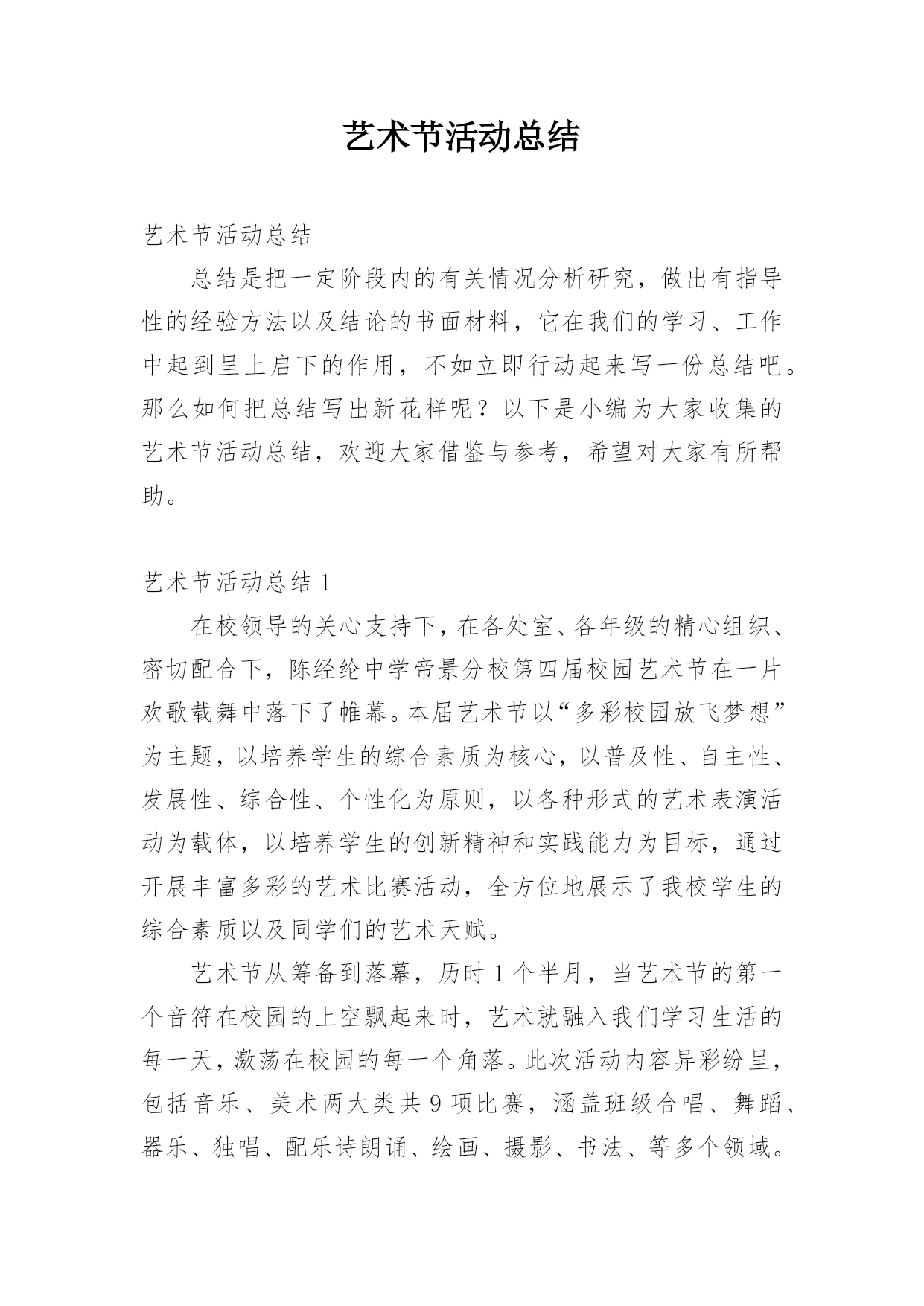 艺术节活动总结艺术节活动总结总结是把一定阶段内的有关情况分析研究,做出有指导性的经验方法以及结论的书面材料,它在我们的学习、工作中起到呈上启下的作用,不如立即行动起来写一份总结吧。那么如何把总结写出新花样呢?以下是小编为大家收集的艺术节活动总结,欢迎大家借鉴与参考,希望对大家有所帮助。艺术节活动总结1在校领导的关心支持下,在各处室、各年级的精心组织、密切配合下,陈经纶中学帝景分校第四届校园艺术节在一片欢歌载舞中落下了帷幕。本届艺术节以“多彩校园放飞梦想”为主题,以培养学生的综合素质为核心,以普及性、自主性