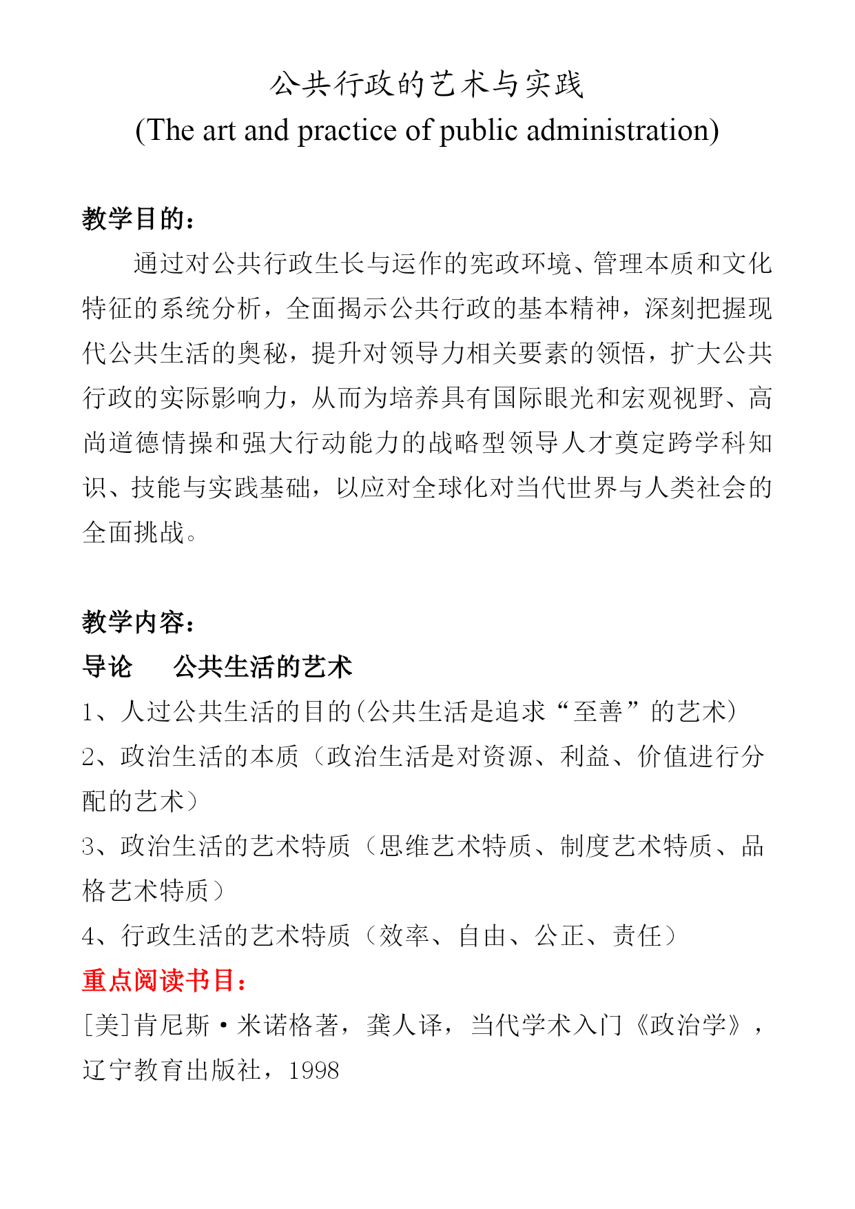 公共行政的艺术与实践(Theartandpracticeofpublicadministration)教学目的:通过对公共行政生长与运作的宪政环境、管理本质和文化特征的系统分析,全面揭示公共行政的基本精神,深刻把握现代公共生活的奥秘,提升对领导力相关要素的领悟,扩大公共行政的实际影响力,从而为培养具有国际眼光和宏观视野、高尚道德情操和强大行动能力的战略型领导人才奠定跨学科知识、技能与实践基础,以应对全球化对当代世界与人类社会的全面挑战。教学内容:导论公共生活的艺术1、人过公共生活的目的(公共生活是追求“至