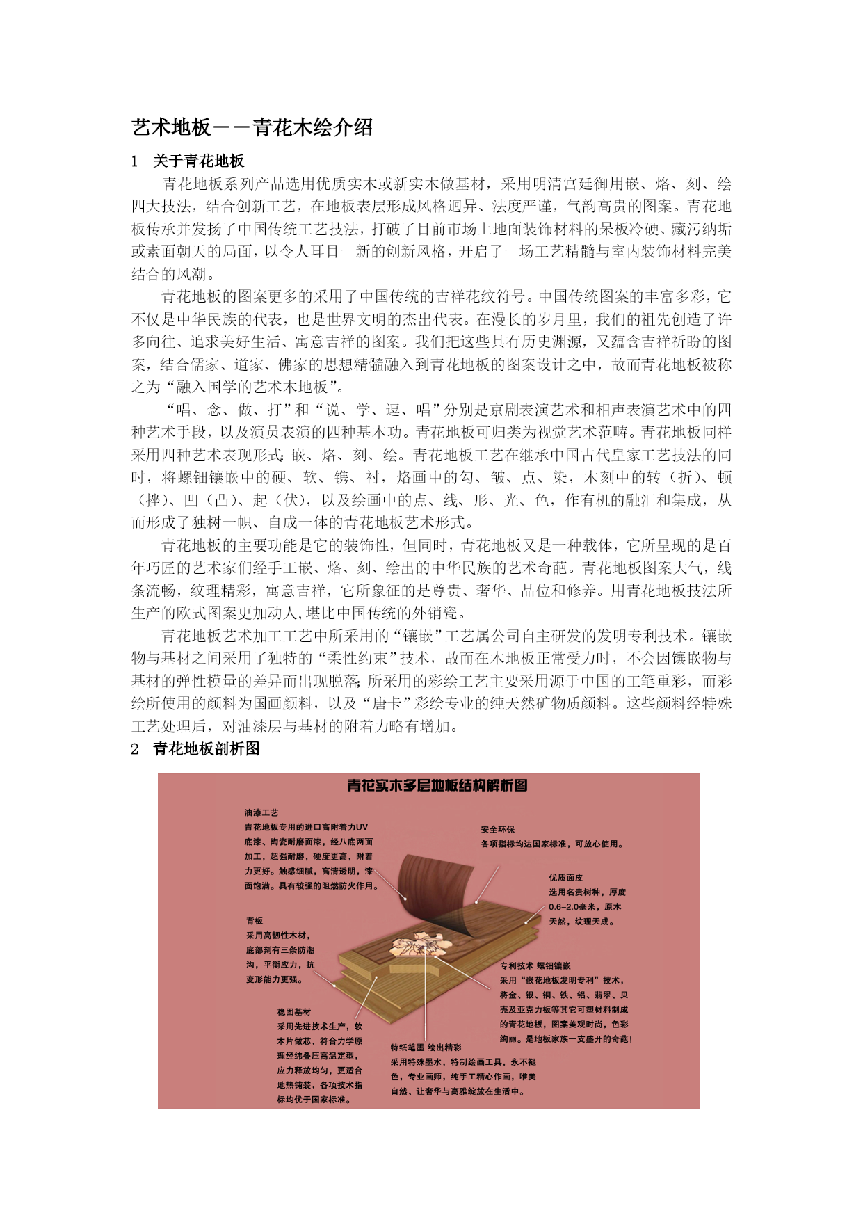 艺术地板――青花木绘介绍1关于青花地板青花地板系列产品选用优质实木或新实木做基材,采用明清宫廷御用嵌、烙、刻、绘四大技法,结合创新工艺,在地板表层形成风格迥异、法度严谨,气韵高贵的图案。青花地板传承并发扬了中国传统工艺技法,打破了目前市场上地面装饰材料的呆板冷硬、藏污纳垢或素面朝天的局面,以令人耳目一新的创新风格,开启了一场工艺精髓与室内装饰材料完美结合的风潮。青花地板的图案更多的采用了中国传统的吉祥花纹符号。中国传统图案的丰富多彩,它不仅是中华民族的代表,也是世界文明的杰出代表。在漫长的岁月里,我们的祖