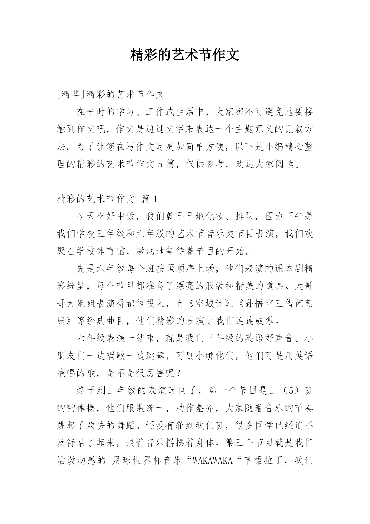 精彩的艺术节作文[精华]精彩的艺术节作文在平时的学习、工作或生活中,大家都不可避免地要接触到作文吧,作文是通过文字来表达一个主题意义的记叙方法。为了让您在写作文时更加简单方便,以下是小编精心整理的精彩的艺术节作文5篇,仅供参考,欢迎大家阅读。精彩的艺术节作文篇1今天吃好中饭,我们就早早地化妆、排队,因为下午是我们学校三年级和六年级的艺术节音乐类节目表演,我们欢聚在学校体育馆,激动地等待着节目的开始。先是六年级每个班按照顺序上场,他们表演的课本剧精彩纷呈,每个节目都准备了漂亮的服装和精美的道具。大哥哥大姐姐