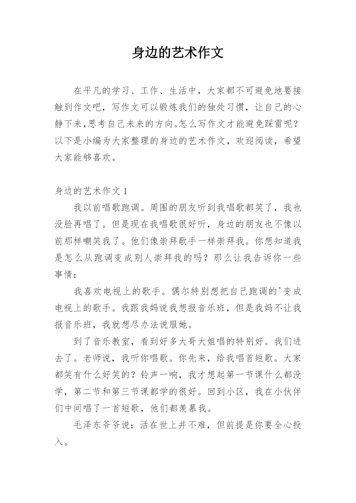 身边的艺术作文在平凡的学习、工作、生活中,大家都不可避免地要接触到作文吧,写作文可以锻炼我们的独处习惯,让自己的心静下来,思考自己未来的方向。怎么写作文才能避免踩雷呢?以下是小编为大家整理的身边的艺术作文,欢迎阅读,希望大家能够喜欢。身边的艺术作文1我以前唱歌跑调。周围的朋友听到我唱歌都笑了,我也没脸再唱了。但是现在我唱歌很好听,身边的朋友也不像以前那样嘲笑我了。他们像崇拜歌手一样崇拜我。你想知道我是怎么从跑调变成别人崇拜我的吗?那么让我告诉你一些事情:我喜欢电视上的歌手。偶尔特别想把自己跑调的'变成电视