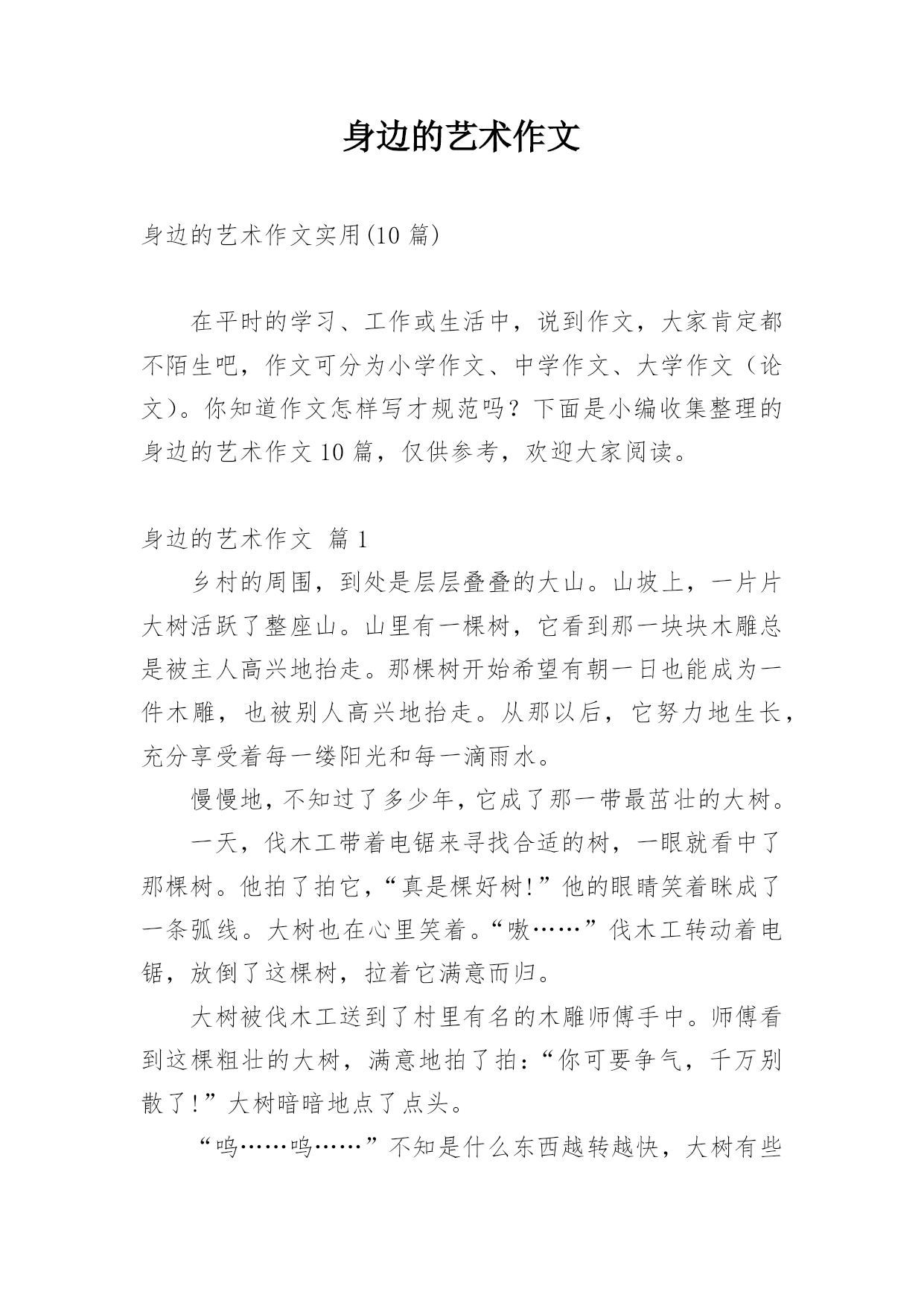 身边的艺术作文身边的艺术作文实用(10篇)在平时的学习、工作或生活中,说到作文,大家肯定都不陌生吧,作文可分为小学作文、中学作文、大学作文(论文)。你知道作文怎样写才规范吗?下面是小编收集整理的身边的艺术作文10篇,仅供参考,欢迎大家阅读。身边的艺术作文篇1乡村的周围,到处是层层叠叠的大山。山坡上,一片片大树活跃了整座山。山里有一棵树,它看到那一块块木雕总是被主人高兴地抬走。那棵树开始希望有朝一日也能成为一件木雕,也被别人高兴地抬走。从那以后,它努力地生长,充分享受着每一缕阳光和每一滴雨水。慢慢地,不知过