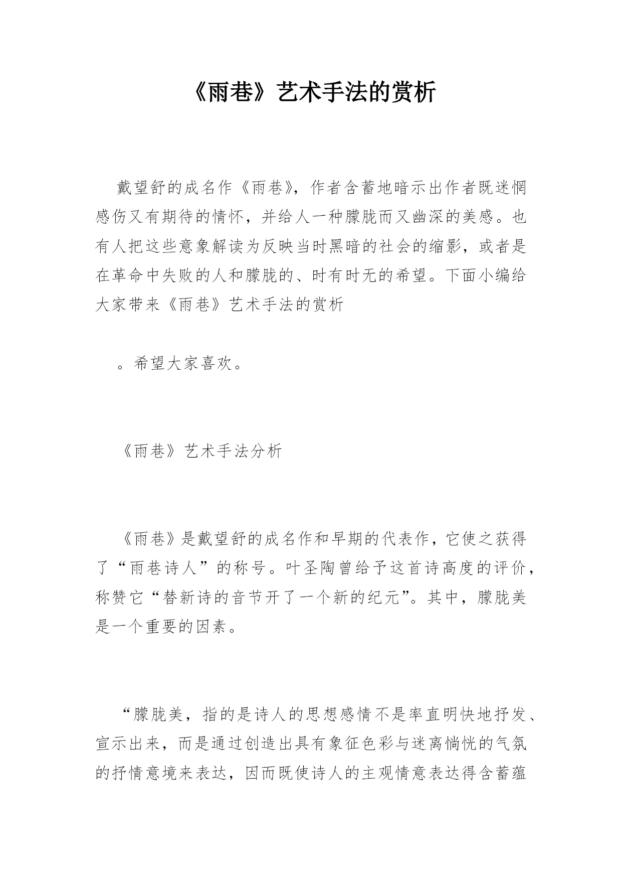 《雨巷》艺术手法的赏析戴望舒的成名作《雨巷》,作者含蓄地暗示出作者既迷惘感伤又有期待的情怀,并给人一种朦胧而又幽深的美感。也有人把这些意象解读为反映当时黑暗的社会的缩影,或者是在革命中失败的人和朦胧的、时有时无的希望。下面小编给大家带来《雨巷》艺术手法的赏析。希望大家喜欢。《雨巷》艺术手法分析《雨巷》是戴望舒的成名作和早期的代表作,它使之获得了“雨巷诗人”的称号。叶圣陶曾给予这首诗高度的评价,称赞它“替新诗的音节开了一个新的纪元”。其中,朦胧美是一个重要的因素。“朦胧美,指的是诗人的思想感情不是率直明快地