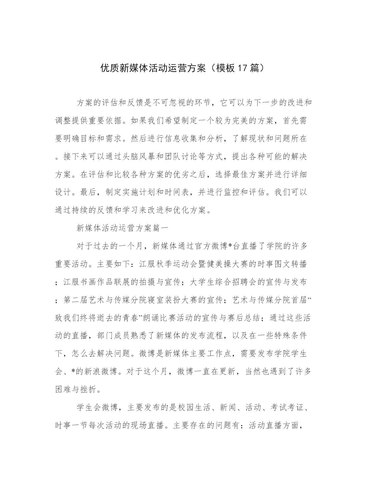 优质新媒体活动运营方案(模板17篇)方案的评估和反馈是不可忽视的环节,它可以为下一步的改进和调整提供重要依据。如果我们希望制定一个较为完美的方案,首先需要明确目标和需求。然后进行信息收集和分析,了解现状和问题所在。接下来可以通过头脑风暴和团队讨论等方式,提出各种可能的解决方案。在评估和比较各种方案的优劣之后,选择最佳方案并进行详细设计。最后,制定实施计划和时间表,并进行监控和评估。我们可以通过持续的反馈和学习来改进和优化方案。新媒体活动运营方案篇一对于过去的一个月,新媒体通过官方微博*台直播了学院的许多重