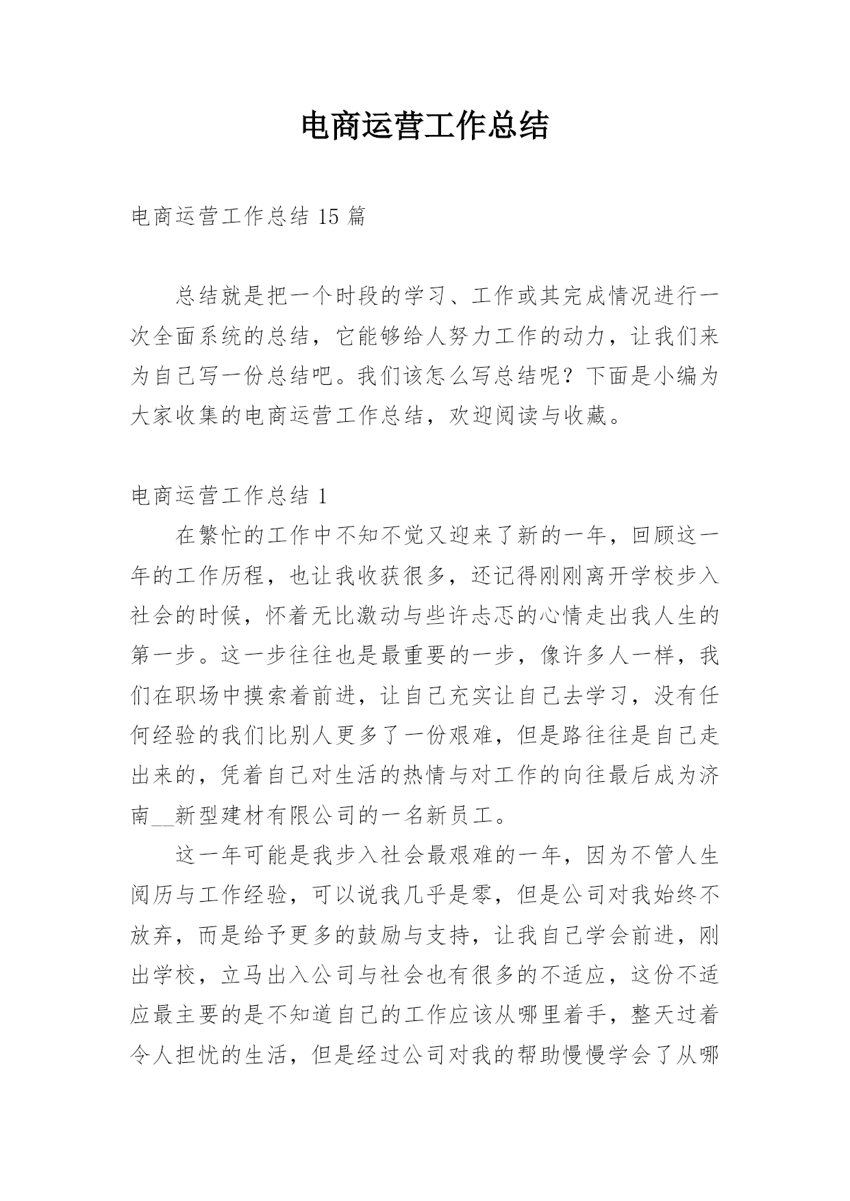 电商运营工作总结电商运营工作总结15篇总结就是把一个时段的学习、工作或其完成情况进行一次全面系统的总结,它能够给人努力工作的动力,让我们来为自己写一份总结吧。我们该怎么写总结呢?下面是小编为大家收集的电商运营工作总结,欢迎阅读与收藏。电商运营工作总结1在繁忙的工作中不知不觉又迎来了新的一年,回顾这一年的工作历程,也让我收获很多,还记得刚刚离开学校步入社会的时候,怀着无比激动与些许忐忑的心情走出我人生的第一步。这一步往往也是最重要的一步,像许多人一样,我们在职场中摸索着前进,让自己充实让自己去学习,没有任何