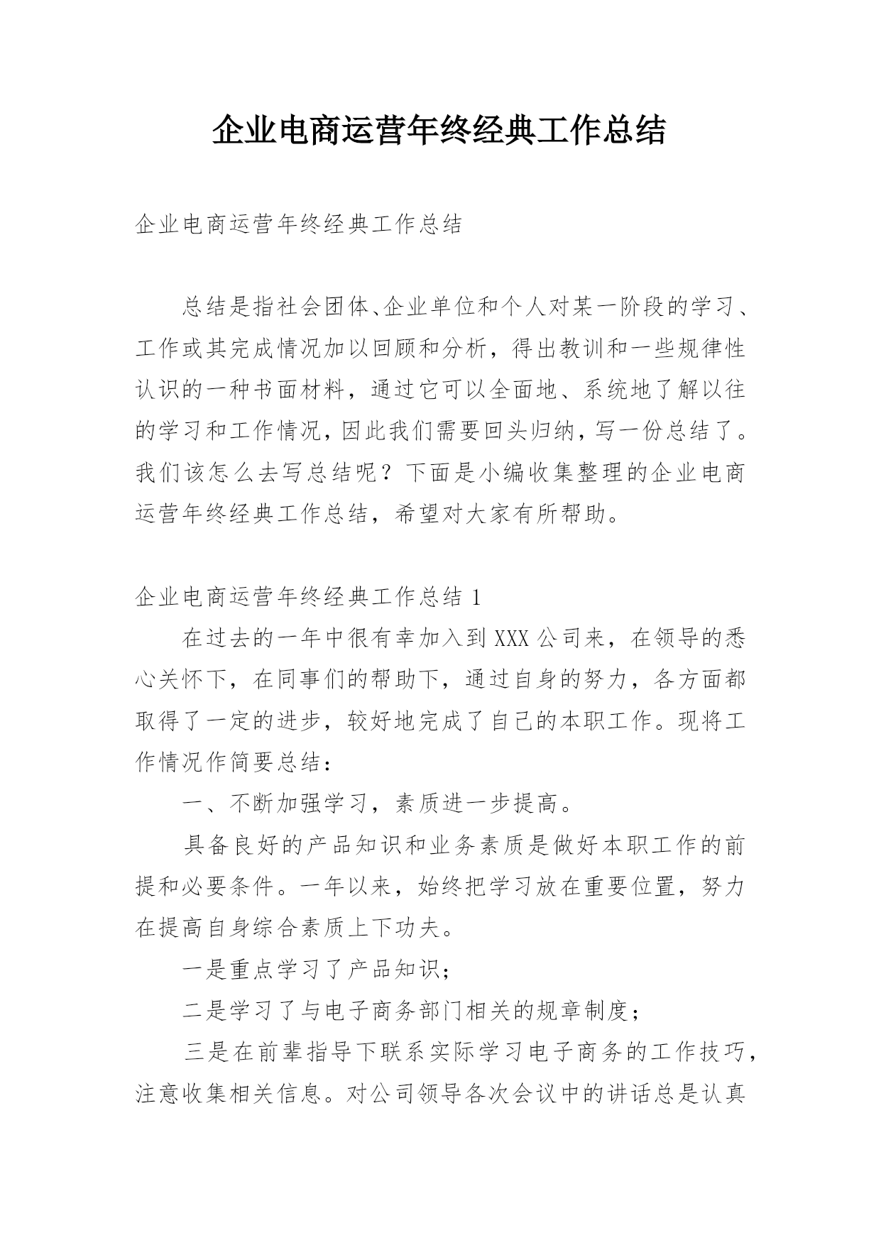 企业电商运营年终经典工作总结企业电商运营年终经典工作总结总结是指社会团体、企业单位和个人对某一阶段的学习、工作或其完成情况加以回顾和分析,得出教训和一些规律性认识的一种书面材料,通过它可以全面地、系统地了解以往的学习和工作情况,因此我们需要回头归纳,写一份总结了。我们该怎么去写总结呢?下面是小编收集整理的企业电商运营年终经典工作总结,希望对大家有所帮助。企业电商运营年终经典工作总结1在过去的一年中很有幸加入到XXX公司来,在领导的悉心关怀下,在同事们的帮助下,通过自身的努力,各方面都取得了一定的进步,较好