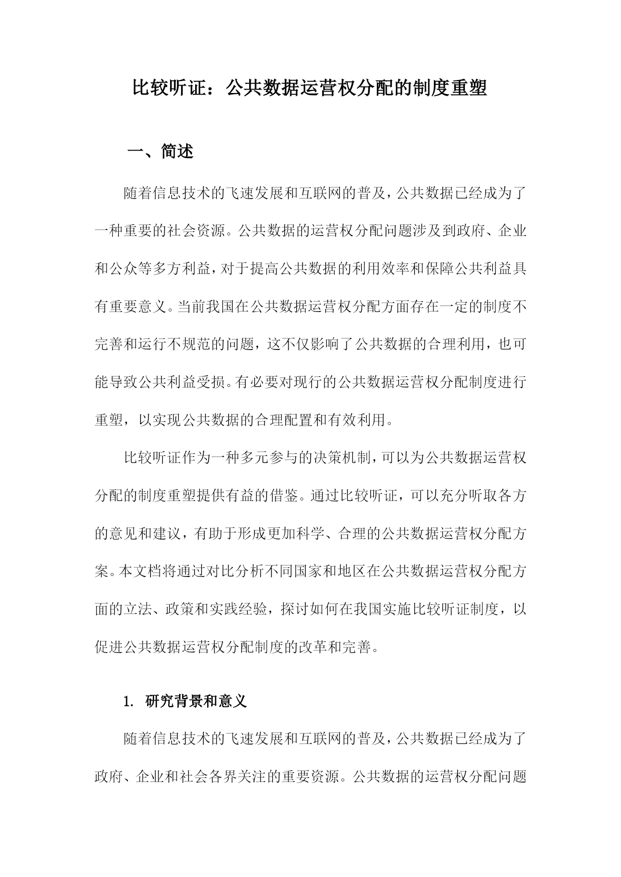 比较听证:公共数据运营权分配的制度重塑一、简述随着信息技术的飞速发展和互联网的普及,公共数据已经成为了一种重要的社会资源。公共数据的运营权分配问题涉及到政府、企业和公众等多方利益,对于提高公共数据的利用效率和保障公共利益具有重要意义。当前我国在公共数据运营权分配方面存在一定的制度不完善和运行不规范的问题,这不仅影响了公共数据的合理利用,也可能导致公共利益受损。有必要对现行的公共数据运营权分配制度进行重塑,以实现公共数据的合理配置和有效利用。比较听证作为一种多元参与的决策机制,可以为公共数据运营权分配的制度