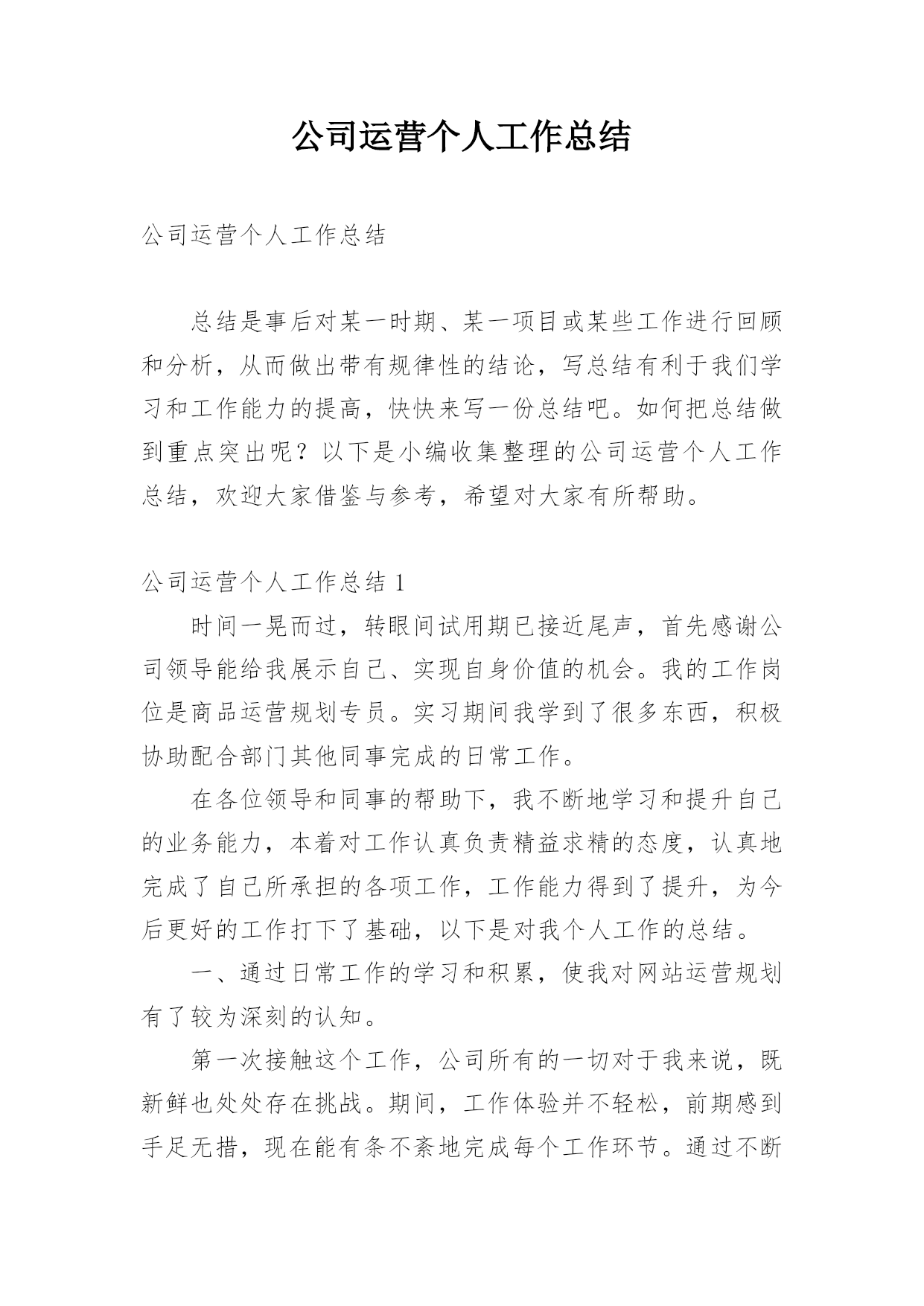 公司运营个人工作总结公司运营个人工作总结总结是事后对某一时期、某一项目或某些工作进行回顾和分析,从而做出带有规律性的结论,写总结有利于我们学习和工作能力的提高,快快来写一份总结吧。如何把总结做到重点突出呢?以下是小编收集整理的公司运营个人工作总结,欢迎大家借鉴与参考,希望对大家有所帮助。公司运营个人工作总结1时间一晃而过,转眼间试用期已接近尾声,首先感谢公司领导能给我展示自己、实现自身价值的机会。我的工作岗位是商品运营规划专员。实习期间我学到了很多东西,积极协助配合部门其他同事完成的日常工作。在各位领导和