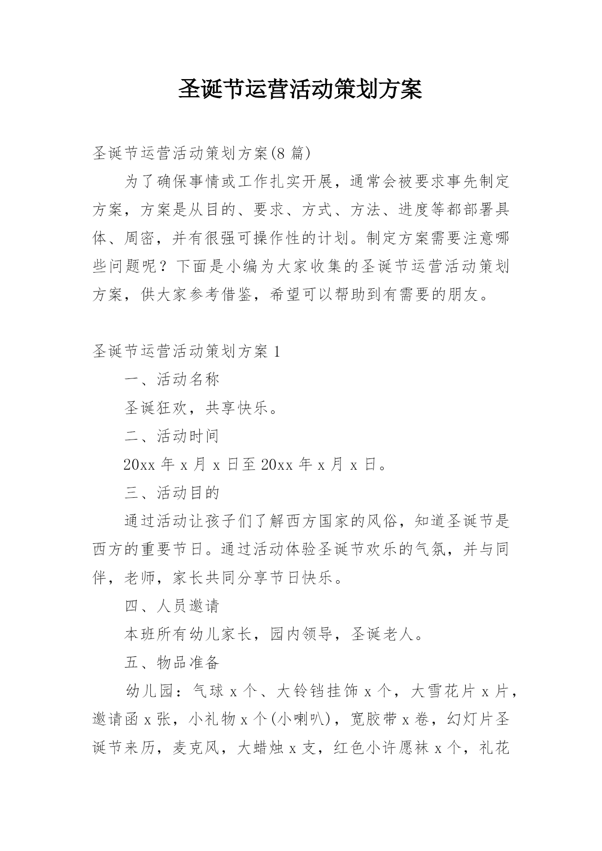 圣诞节运营活动策划方案圣诞节运营活动策划方案(8篇)为了确保事情或工作扎实开展,通常会被要求事先制定方案,方案是从目的、要求、方式、方法、进度等都部署具体、周密,并有很强可操作性的计划。制定方案需要注意哪些问题呢?下面是小编为大家收集的圣诞节运营活动策划方案,供大家参考借鉴,希望可以帮助到有需要的朋友。圣诞节运营活动策划方案1一、活动名称圣诞狂欢,共享快乐。二、活动时间20xx年x月x日至20xx年x月x日。三、活动目的通过活动让孩子们了解西方国家的风俗,知道圣诞节是西方的重要节日。通过活动体验圣诞节欢乐