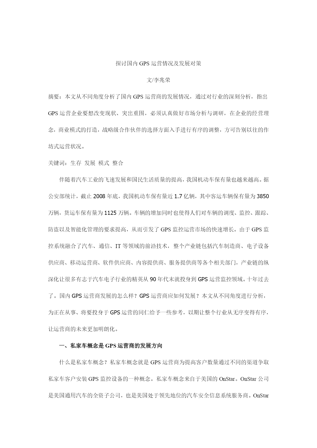探讨国内GPS运营情况及发展对策文/李兆荣摘要:本文从不同角度分析了国内GPS运营商的发展情况,通过对行业的深刻分析,指出GPS运营企业要想改变现状、突出重围,必须认真做好市场分析与调研,在企业的经营理念,商业模式的打造,战略级合作伙伴的选择方面入手进行有序的调整,方可告别以往的作坊式运营状况。关键词:生存发展模式整合伴随着汽车工业的飞速发展和国民生活质量的提高,我国机动车保有量也越来越高。据公安部统计,截止2008年底,我国机动车保有量近1.7亿辆,其中客运车辆保有量为3850万辆,货运车保有量为112