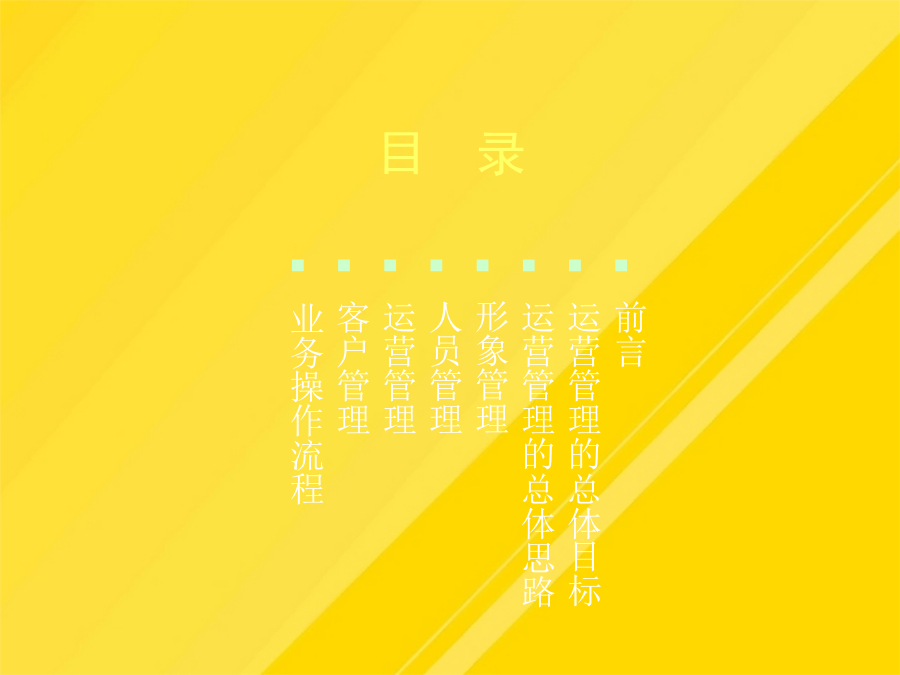目录运营管理的总体目标运营管理的总体思路整个直营店工作的核心是现金流,现金流是评估直营销售业绩的根本依据。产品质量、终端推广和监控对直营拓展提供支持;对员工的业绩进行合理的激励依据产品类别分区,在货架上以不同颜色表示不同的产品陈列。PROFRESSIONAL-给予店面人员相应的产品、销售技巧培训,制定相关的奖励-有助于经验的总结、分享对于半年到一年没有销售出去的产品,不仅占用大量资金,影响资金周转的同时也使得更多的获利机会被丧失。直营店人员管理岗位操作规范上海直营形象店运营管理-直营店前一年度的销售状况分