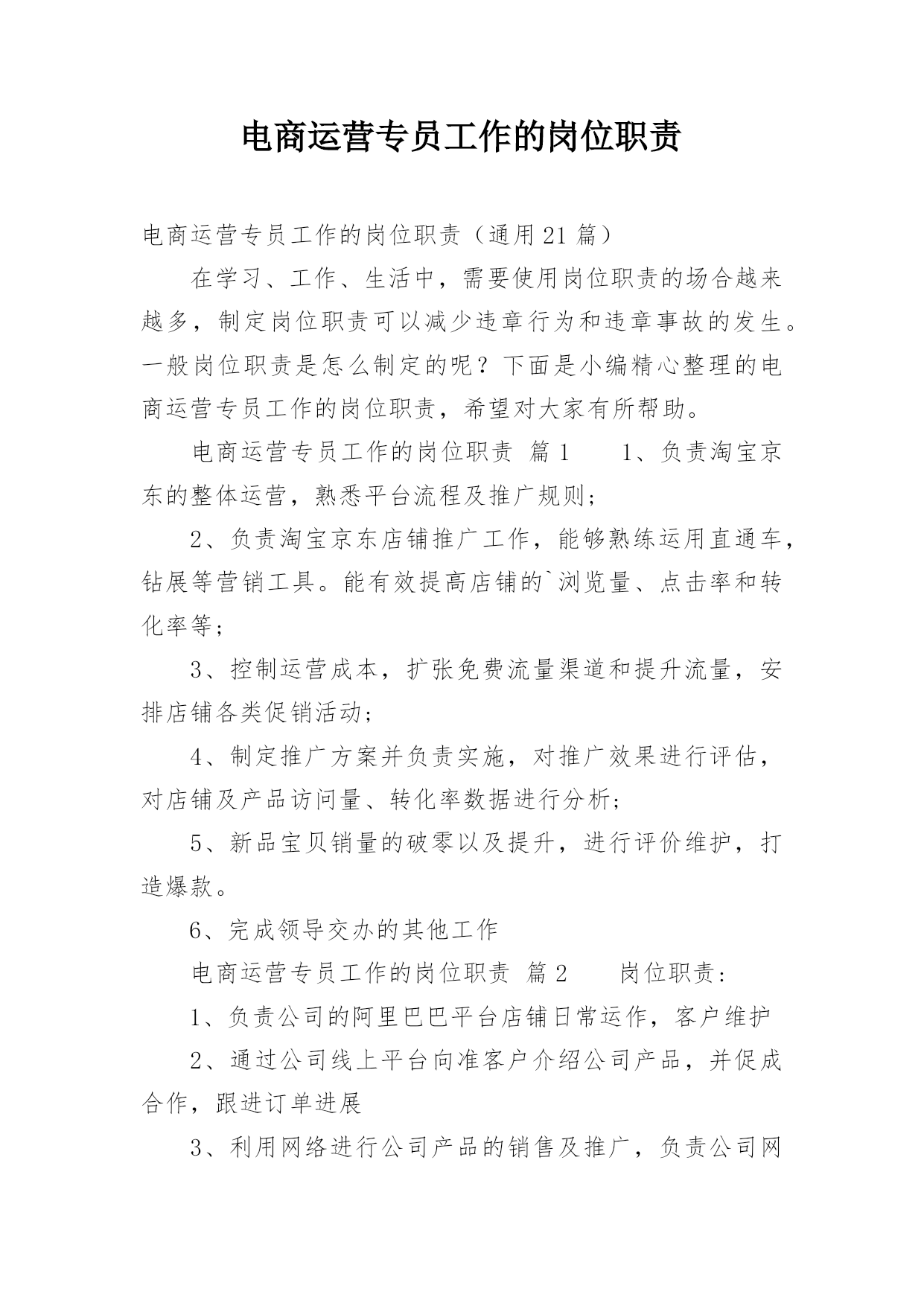 电商运营专员工作的岗位职责电商运营专员工作的岗位职责(通用21篇)在学习、工作、生活中,需要使用岗位职责的场合越来越多,制定岗位职责可以减少违章行为和违章事故的发生。一般岗位职责是怎么制定的呢?下面是小编精心整理的电商运营专员工作的岗位职责,希望对大家有所帮助。电商运营专员工作的岗位职责篇11、负责淘宝京东的整体运营,熟悉平台流程及推广规则;2、负责淘宝京东店铺推广工作,能够熟练运用直通车,钻展等营销工具。能有效提高店铺的`浏览量、点击率和转化率等;3、控制运营成本,扩张免费流量渠道和提升流量,安排店铺各