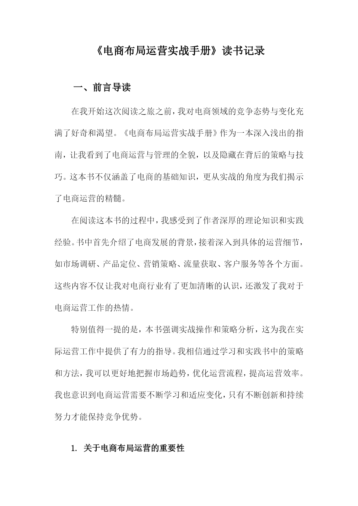 《电商布局运营实战手册》读书记录一、前言导读在我开始这次阅读之旅之前,我对电商领域的竞争态势与变化充满了好奇和渴望。《电商布局运营实战手册》作为一本深入浅出的指南,让我看到了电商运营与管理的全貌,以及隐藏在背后的策略与技巧。这本书不仅涵盖了电商的基础知识,更从实战的角度为我们揭示了电商运营的精髓。在阅读这本书的过程中,我感受到了作者深厚的理论知识和实践经验。书中首先介绍了电商发展的背景,接着深入到具体的运营细节,如市场调研、产品定位、营销策略、流量获取、客户服务等各个方面。这些内容不仅让我对电商行业有了更