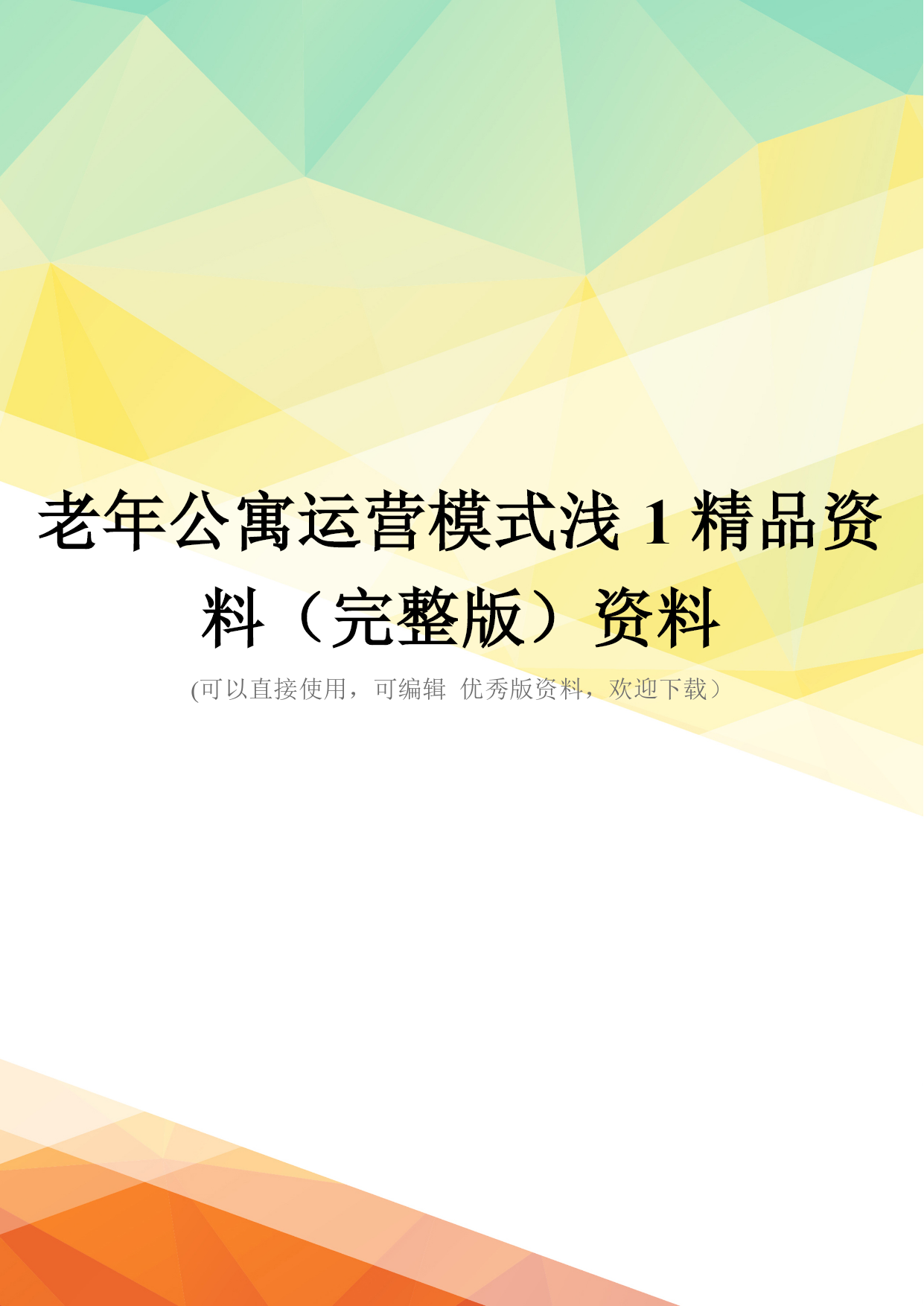 老年公寓运营模式浅1精品资料(完整版)资料(可以直接使用,可编辑优秀版资料,欢迎下载)老年公寓运营模式浅析加入日期:2006-4-2215:20:18作者:佚名来自:中国办公网阅读次数:中国不仅是一个人口大国,同时也是一个老年人口大国,由于中国人口政策的特殊性,目前我国60岁以上老年人口已达1.3亿,占全国总人口的10%以上,到21世纪中叶将超过4亿,占全国总人口的28%。随着中国人口老龄化和经济的快速发展,以及老年人对高质量养老生活的需求,适合不同需求层次的养老方式脱颖而出,其中老年公寓养老逐渐成为能够