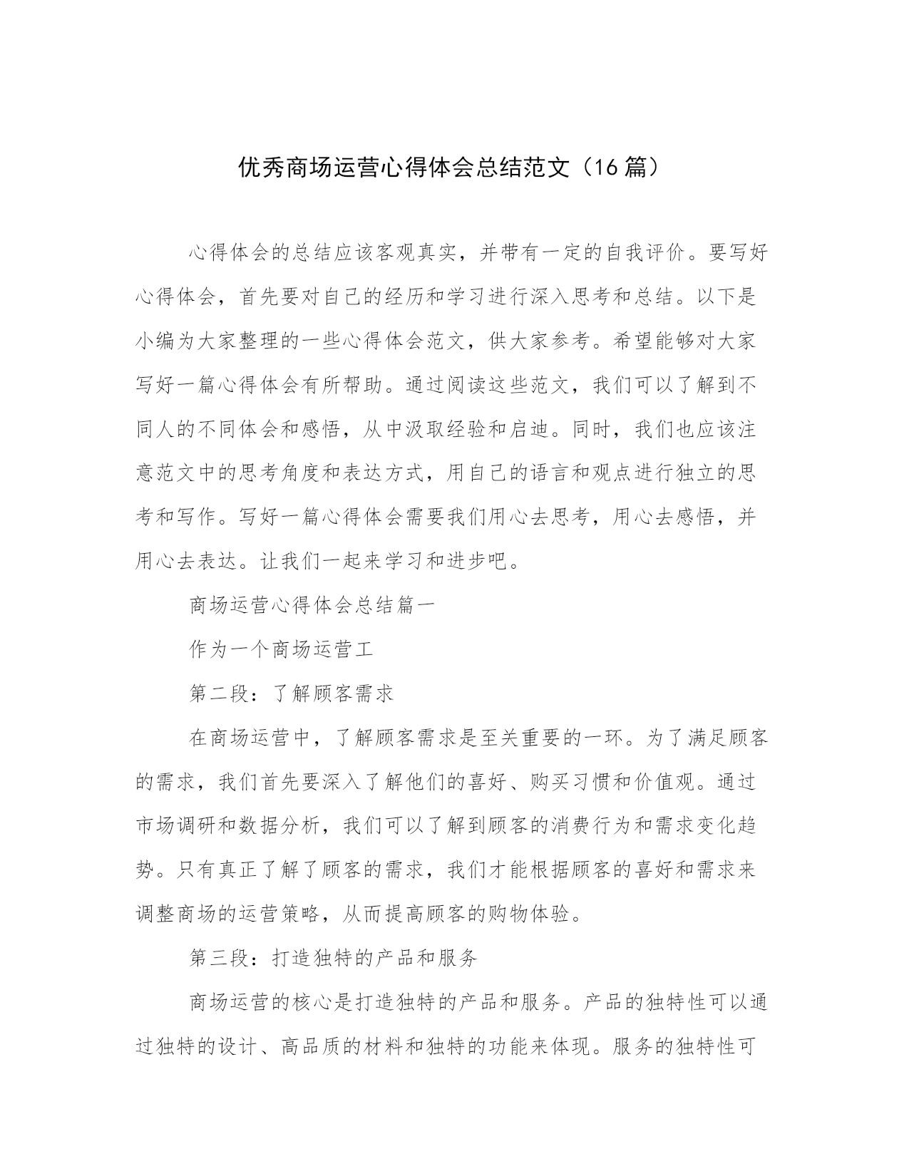 优秀商场运营心得体会总结范文(16篇)心得体会的总结应该客观真实,并带有一定的自我评价。要写好心得体会,首先要对自己的经历和学习进行深入思考和总结。以下是小编为大家整理的一些心得体会范文,供大家参考。希望能够对大家写好一篇心得体会有所帮助。通过阅读这些范文,我们可以了解到不同人的不同体会和感悟,从中汲取经验和启迪。同时,我们也应该注意范文中的思考角度和表达方式,用自己的语言和观点进行独立的思考和写作。写好一篇心得体会需要我们用心去思考,用心去感悟,并用心去表达。让我们一起来学习和进步吧。商场运营心得体会总