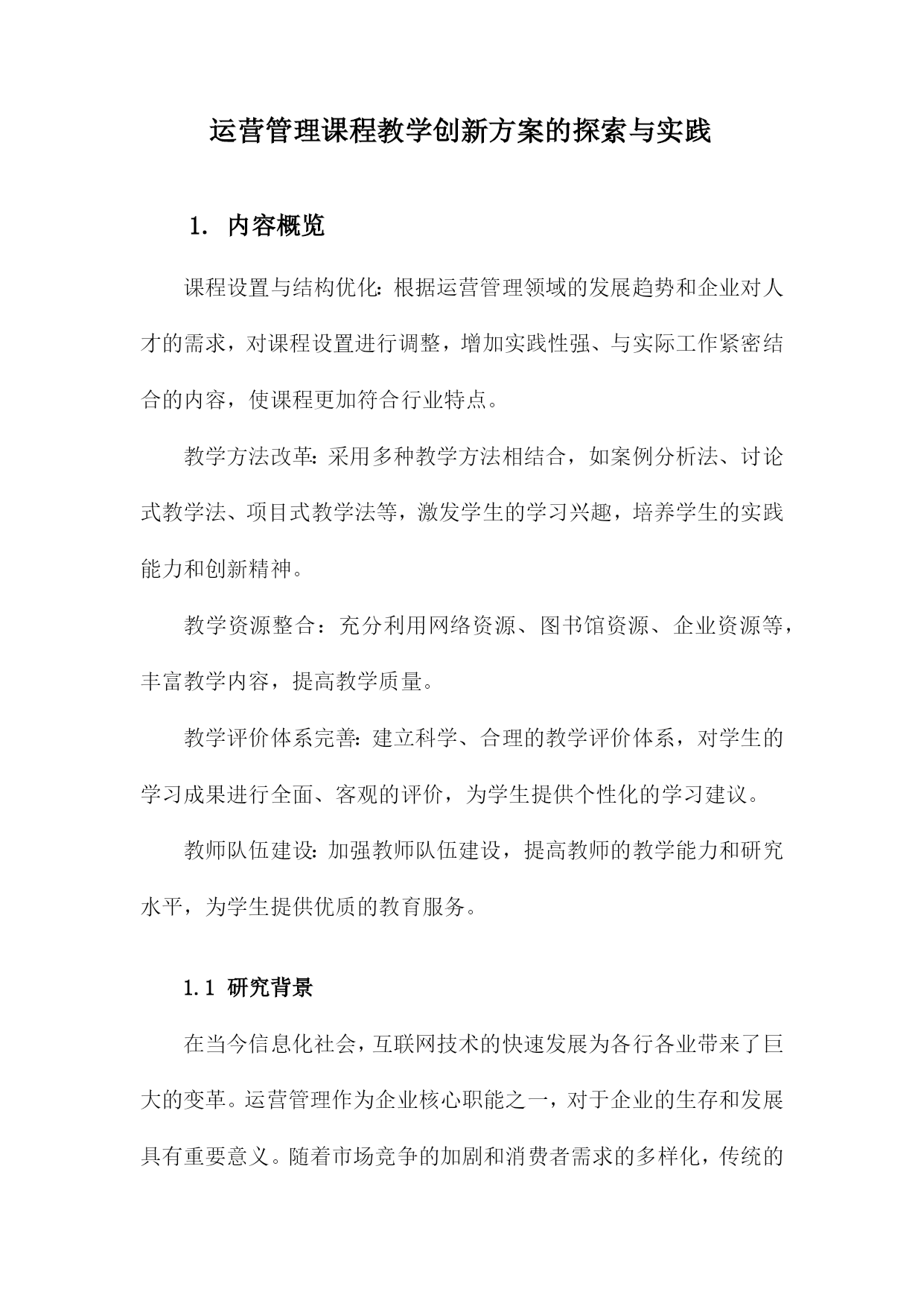 运营管理课程教学创新方案的探索与实践1.内容概览课程设置与结构优化:根据运营管理领域的发展趋势和企业对人才的需求,对课程设置进行调整,增加实践性强、与实际工作紧密结合的内容,使课程更加符合行业特点。教学方法改革:采用多种教学方法相结合,如案例分析法、讨论式教学法、项目式教学法等,激发学生的学习兴趣,培养学生的实践能力和创新精神。教学资源整合:充分利用网络资源、图书馆资源、企业资源等,丰富教学内容,提高教学质量。教学评价体系完善:建立科学、合理的教学评价体系,对学生的学习成果进行全面、客观的评价,为学生提供
