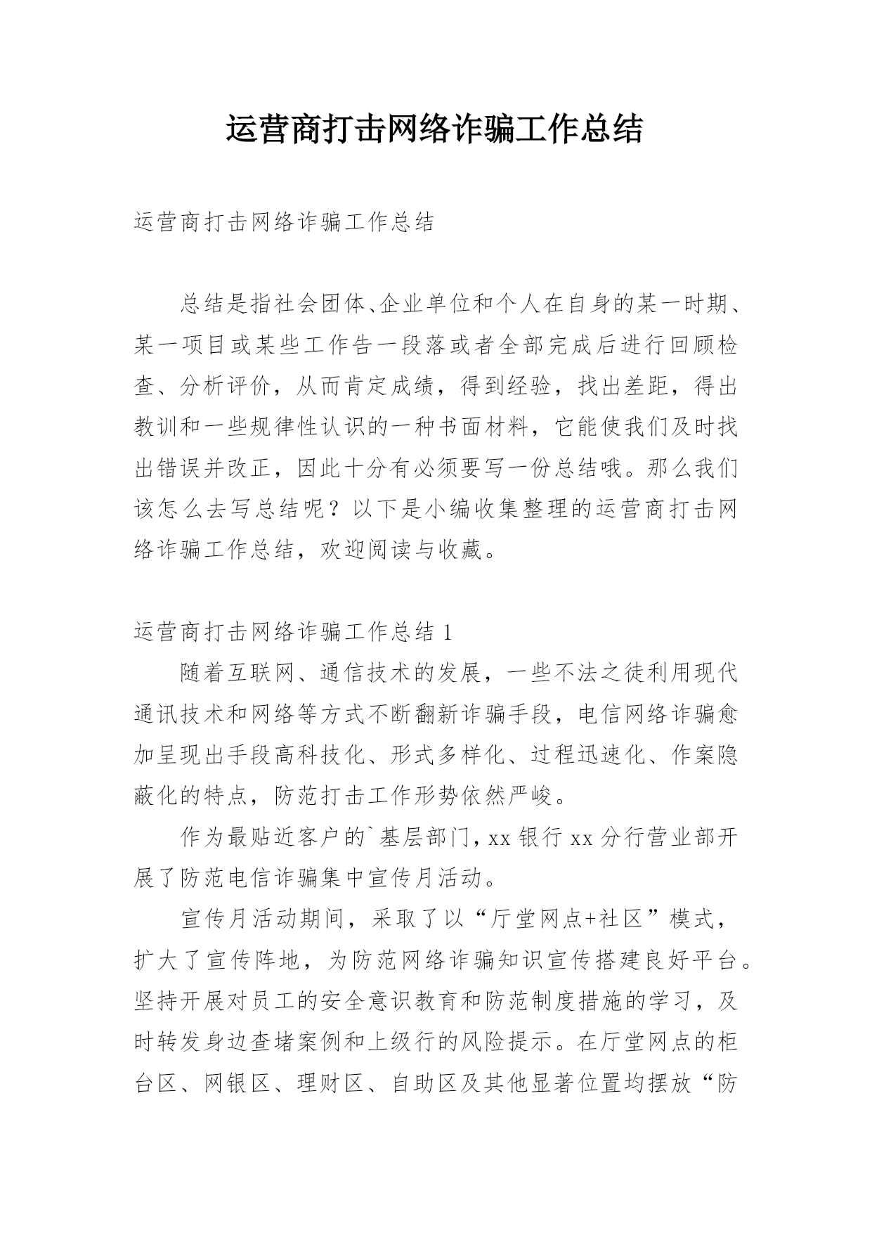运营商打击网络诈骗工作总结运营商打击网络诈骗工作总结总结是指社会团体、企业单位和个人在自身的某一时期、某一项目或某些工作告一段落或者全部完成后进行回顾检查、分析评价,从而肯定成绩,得到经验,找出差距,得出教训和一些规律性认识的一种书面材料,它能使我们及时找出错误并改正,因此十分有必须要写一份总结哦。那么我们该怎么去写总结呢?以下是小编收集整理的运营商打击网络诈骗工作总结,欢迎阅读与收藏。运营商打击网络诈骗工作总结1随着互联网、通信技术的发展,一些不法之徒利用现代通讯技术和网络等方式不断翻新诈骗手段,电信网