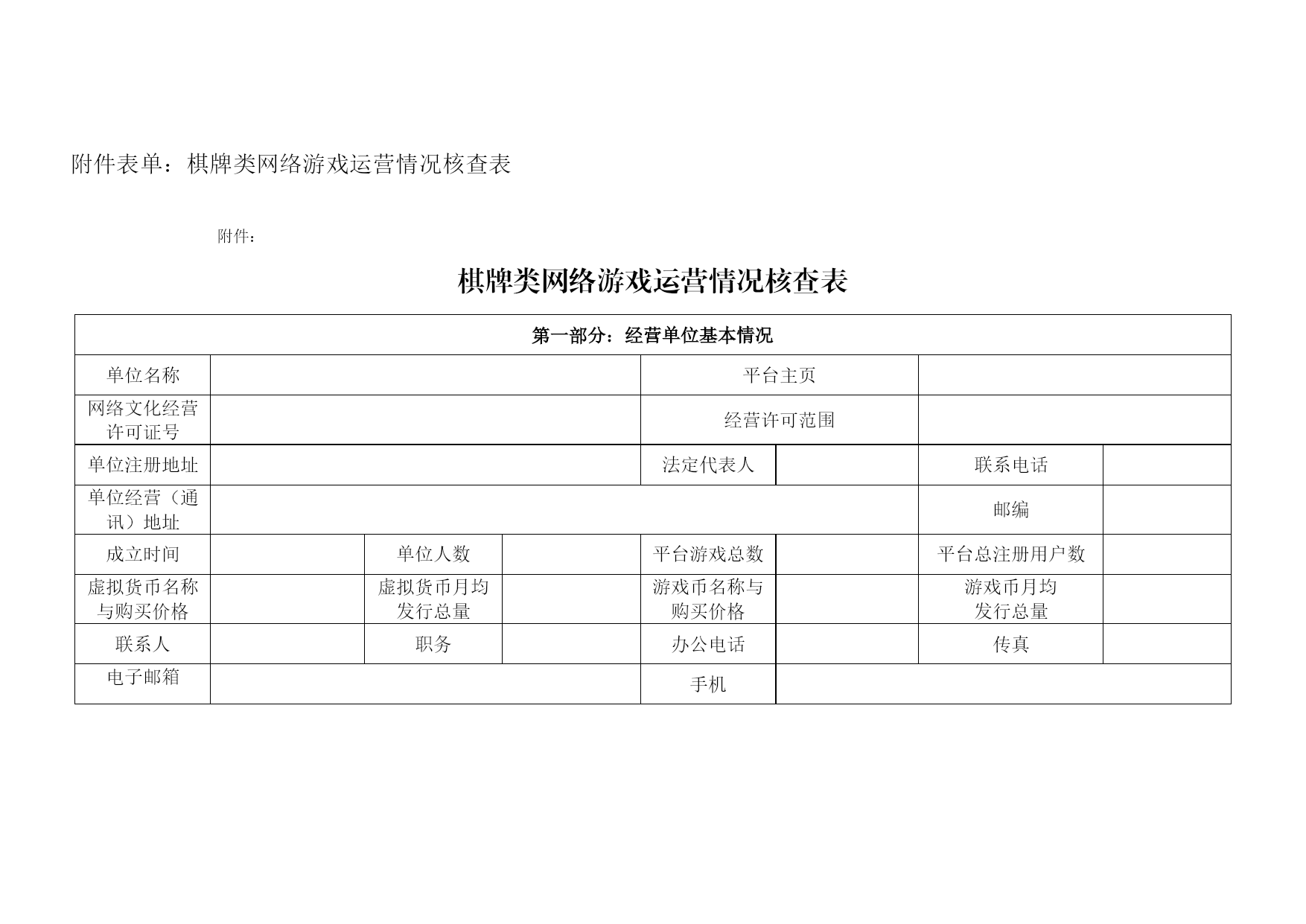 附件表单:HYPERLINK"http://www.ccm.gov.cn/userfiles/File/棋牌类网络游戏运营情况核查表.doc"棋牌类网络游戏运营情况核查表附件:棋牌类网络游戏运营情况核查表第一部分:经营单位基本情况单位名称平台主页网络文化经营许可证号经营许可范围单位注册地址法定代表人联系电话单位经营(通讯)地址邮编成立时间单位人数平台游戏总数平台总注册用户数虚拟货币名称与购买价格虚拟货币月均发行总量游戏币名称与购买价格游戏币月均发行总量联系人职务办公电话传真电子邮箱手机HYPERL